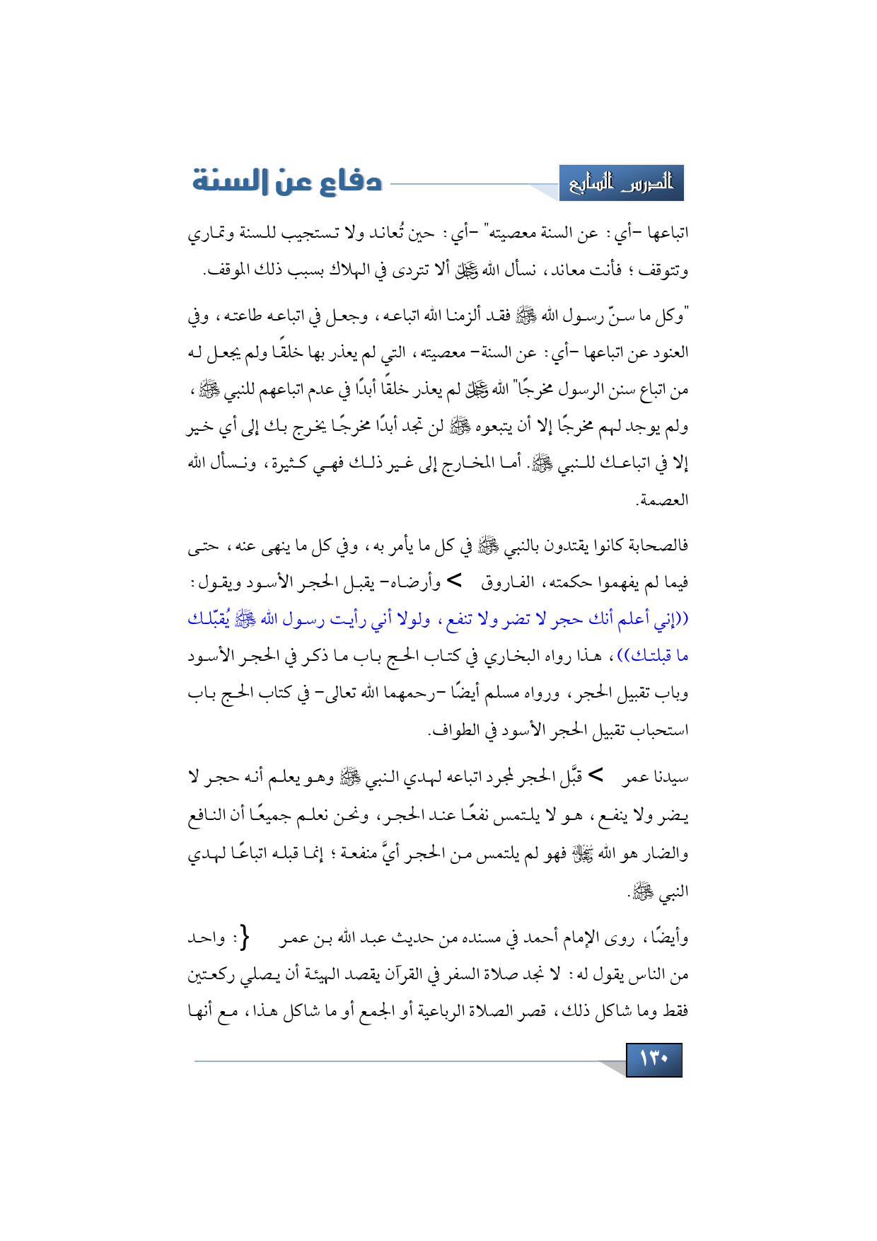 "وكل ما سنّ رسول الله -صلى الله عليه وسلم- فقد ألزمنا الله اتباعه، وجعل في اتباعه طاعته، وفي العنود عن اتباعها -أي: عن السنة- معصيته، التي لم يعذر بها خلقًا ولم يجعل له من اتباع سنن الرسول مخرجًا" الله -عز وجل- لم يعذر خلقًا أبدًا في عدم اتباعهم للنبي -صلى الله عليه وسلم-، ولم يوجد لهم مخرجًا إلا أن يتبعوه -عليه الصلاة والسلام- لن تجد أبدًا مخرجًا يخرج بك إلى أي خير إلا في اتباعك للنبي -صلى الله عليه وسلم. أما المخارج إلى غير ذلك فهي كثيرة، ونسأل الله العصمة.