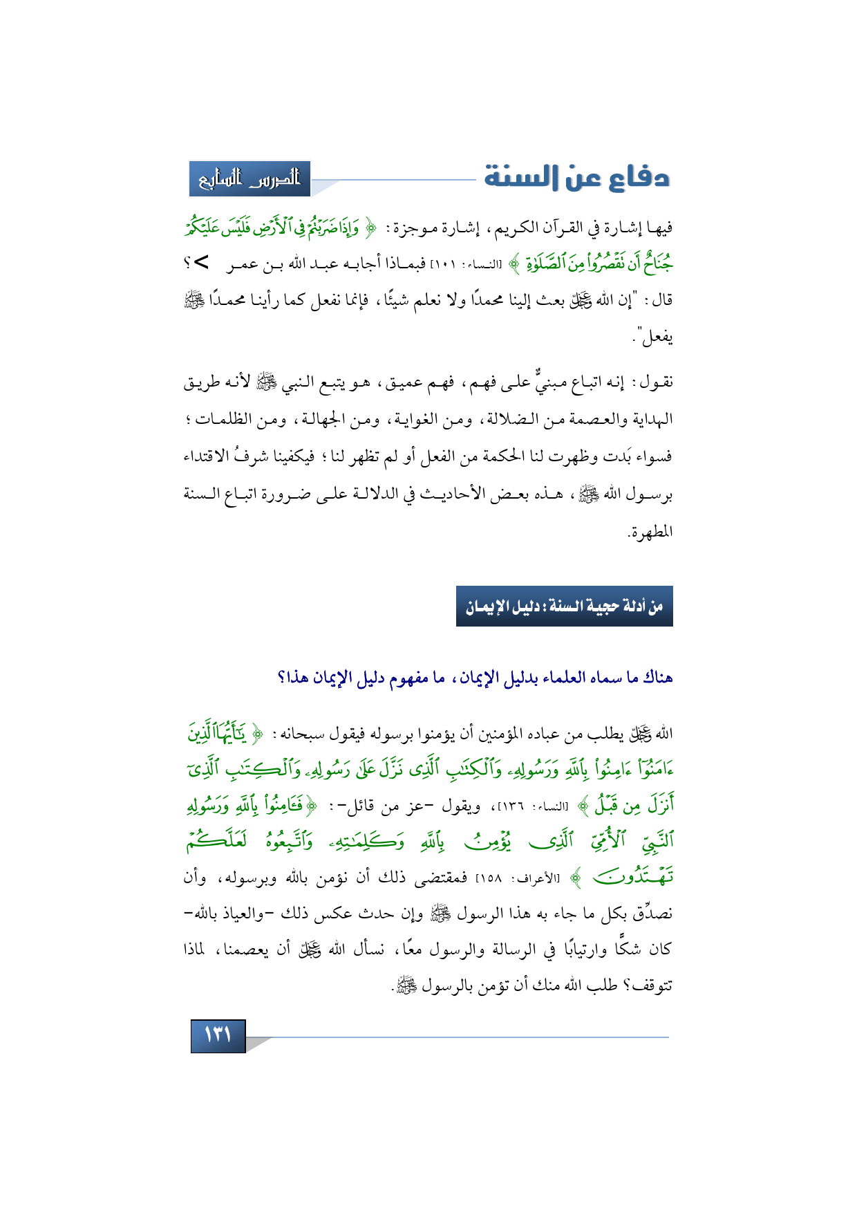فيها إشارة في القرآن الكريم، إشارة موجزة: {وَإِذَا ضَرَبْتُمْ فِي الْأَرْضِ فَلَيْسَ عَلَيْكُمْ جُنَاحٌ أَنْ تَقْصُرُوا مِنَ الصَّلَاةِ} (النساء: 101) فبماذا أجابه عبد الله بن عمر -رضي الله تعالى عنه-؟ قال: "إن الله -عز وجل- بعث إلينا محمدًا ولا نعلم شيئًا، فإنما نفعل كما رأينا محمدًا -صلى الله عليه وسلم- يفعل".