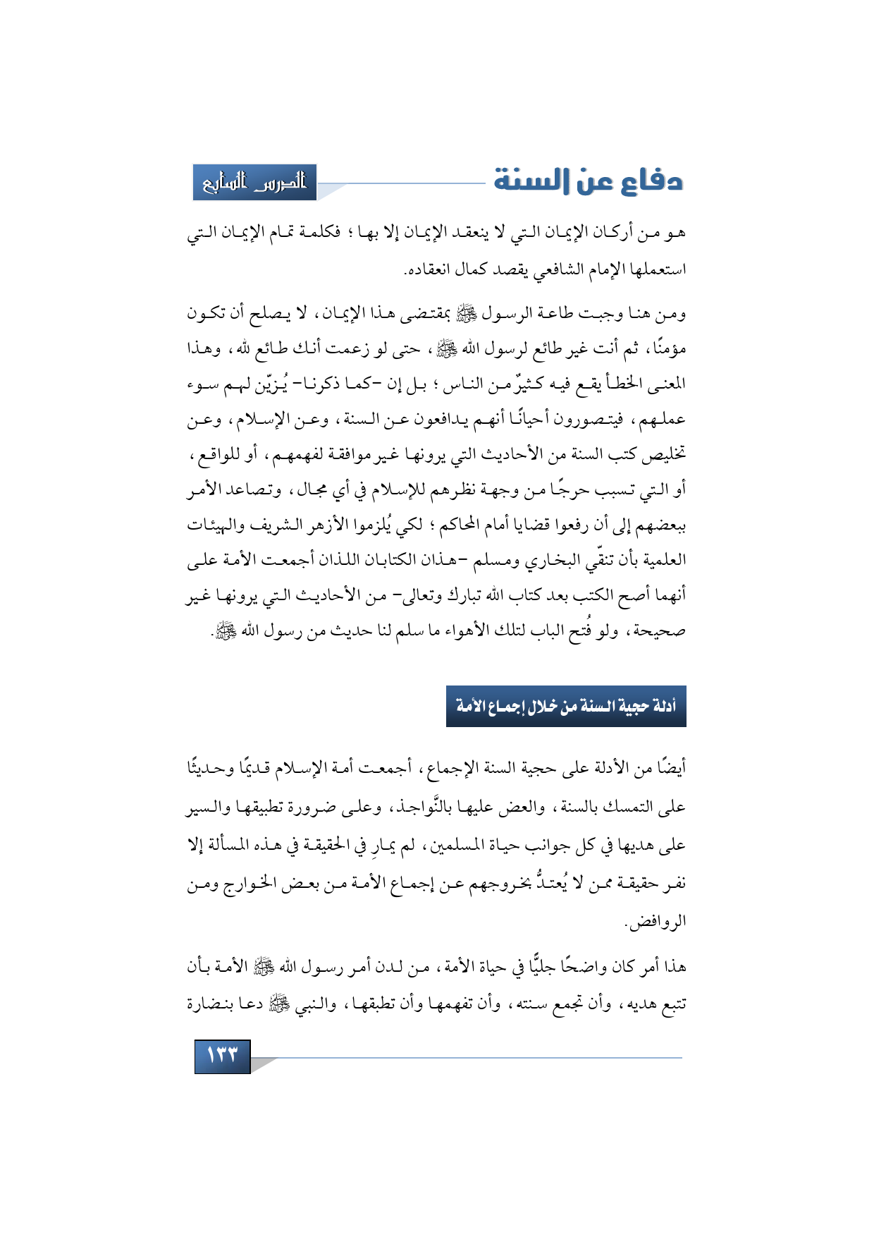 ومن هنا وجبت طاعة الرسول -صلى الله عليه وسلم- بمقتضى هذا الإيمان، لا يصلح أن تكون مؤمنًا، ثم أنت غير طائع لرسول الله -صلى الله عليه وسلم، حتى لو زعمت أنك طائع لله، وهذا المعنى الخطأ يقع فيه كثيرٌ من الناس؛ بل إن -كما ذكرنا- يُزيّن لهم سوء عملهم، فيتصورون أحيانًا أنهم يدافعون عن السنة، وعن الإسلام، وعن تخليص كتب السنة من الأحاديث التي يرونها غير موافقة لفهمهم، أو للواقع، أو التي تسبب حرجًا من وجهة نظرهم للإسلام في أي مجال، وتصاعد الأمر ببعضهم إلى أن رفعوا قضايا أمام المحاكم؛ لكي يُلزموا الأزهر الشريف والهيئات العلمية بأن تنقّي البخاري ومسلم -هذان الكتابان اللذان أجمعت الأمة على أنهما أصح الكتب بعد كتاب الله تبارك وتعالى- من الأحاديث التي يرونها غير صحيحة، ولو فُتح الباب لتلك الأهواء ما سلم لنا حديث من رسول الله -صلى الله عليه وسلم-.