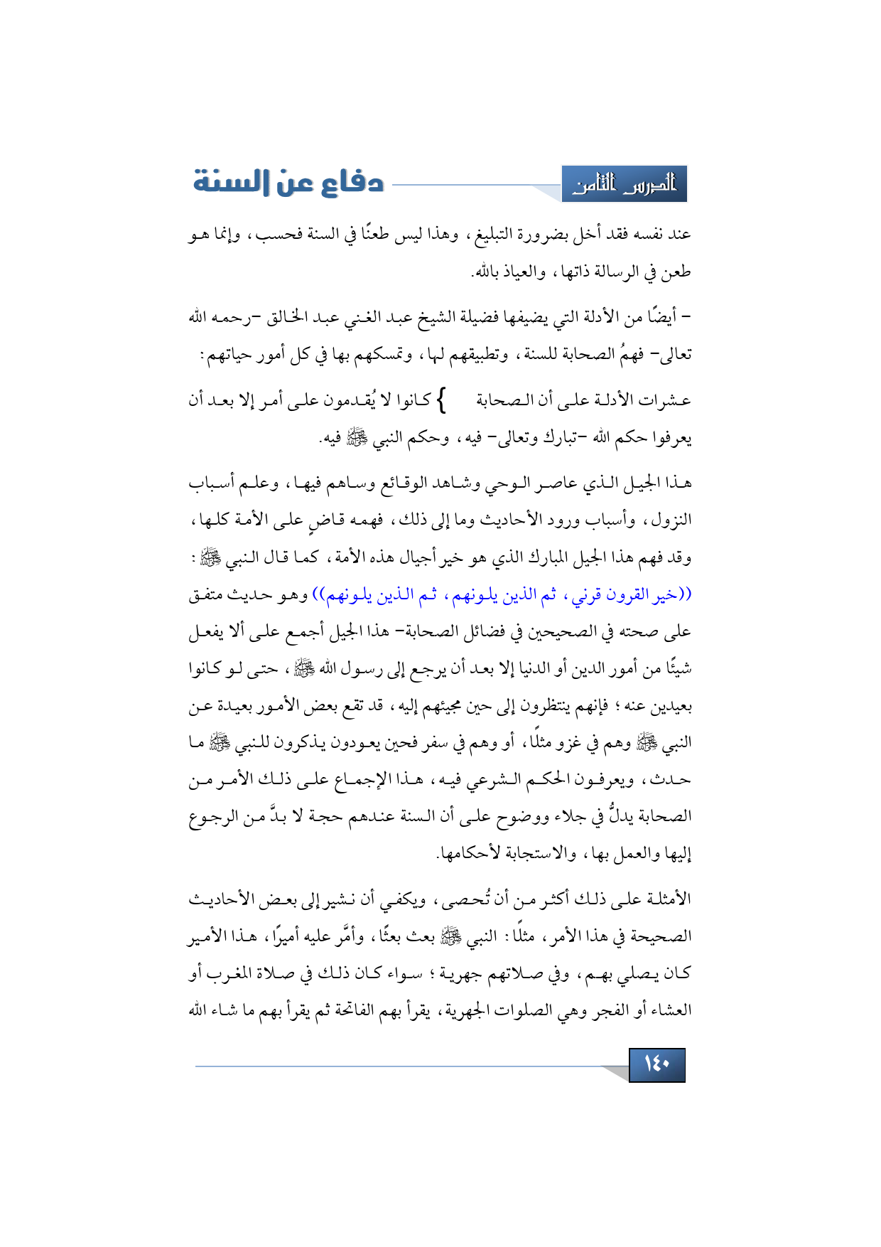 هذا الجيل الذي عاصر الوحي وشاهد الوقائع وساهم فيها، وعلم أسباب النزول، وأسباب ورود الأحاديث وما إلى ذلك، فهمه قاضٍ على الأمة كلها، وقد فهم هذا الجيل المبارك الذي هو خير أجيال هذه الأمة، كما قال النبي -صلى الله عليه وسلم: ((خير القرون قرني، ثم الذين يلونهم، ثم الذين يلونهم)) وهو حديث متفق على صحته في الصحيحين في فضائل الصحابة- هذا الجيل أجمع على ألا يفعل شيئًا من أمور الدين أو الدنيا إلا بعد أن يرجع إلى رسول الله -صلى الله عليه وسلم، حتى لو كانوا بعيدين عنه؛ فإنهم ينتظرون إلى حين مجيئهم إليه، قد تقع بعض الأمور بعيدة عن النبي -صلى الله عليه وسلم- وهم في غزو مثلًا، أو وهم في سفر فحين يعودون يذكرون للنبي -صلى الله عليه وسلم- ما حدث، ويعرفون الحكم الشرعي فيه، هذا الإجماع على ذلك الأمر من الصحابة يدلُّ في جلاء ووضوح على أن السنة عندهم حجة لا بدَّ من الرجوع إليها والعمل بها، والاستجابة لأحكامها.