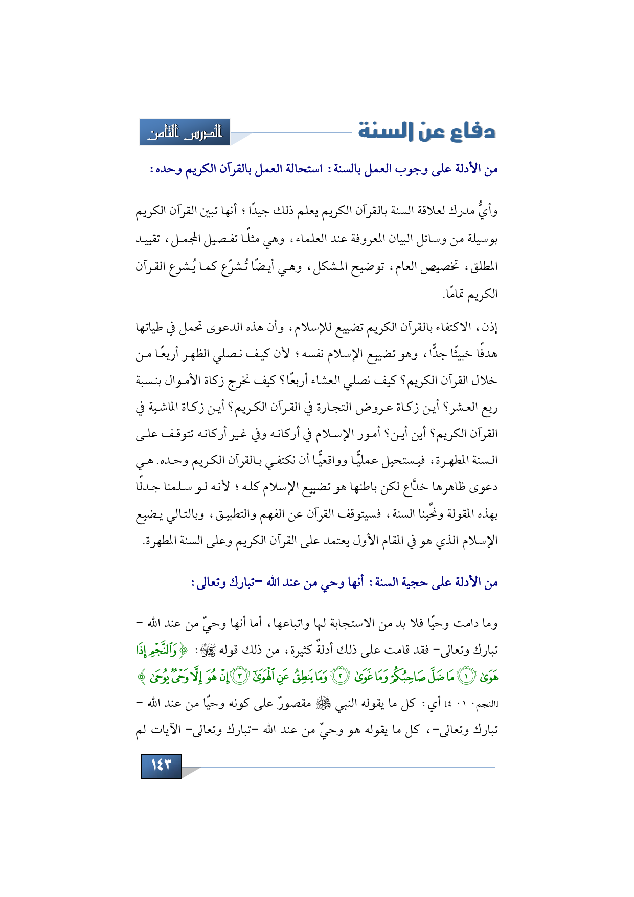 إذن، الاكتفاء بالقرآن الكريم تضييع للإسلام، وأن هذه الدعوى تحمل في طياتها هدفًا خبيثًا جدًّا، وهو تضييع الإسلام نفسه؛ لأن كيف نصلي الظهر أربعًا من خلال القرآن الكريم؟ كيف نصلي العشاء أربعًا؟ كيف نخرج زكاة الأموال بنسبة ربع العشر؟ أين زكاة عروض التجارة في القرآن الكريم؟ أين زكاة الماشية في القرآن الكريم؟ أين أين؟ أمور الإسلام في أركانه وفي غير أركانه تتوقف على السنة المطهرة، فيستحيل عمليًّا وواقعيًّا أن نكتفي بالقرآن الكريم وحده. هي دعوى ظاهرها خدَّاع لكن باطنها هو تضييع الإسلام كله؛ لأنه لو سلمنا جدلًا بهذه المقولة ونحَّينا السنة، فسيتوقف القرآن عن الفهم والتطبيق، وبالتالي يضيع الإسلام الذي هو في المقام الأول يعتمد على القرآن الكريم وعلى السنة المطهرة.