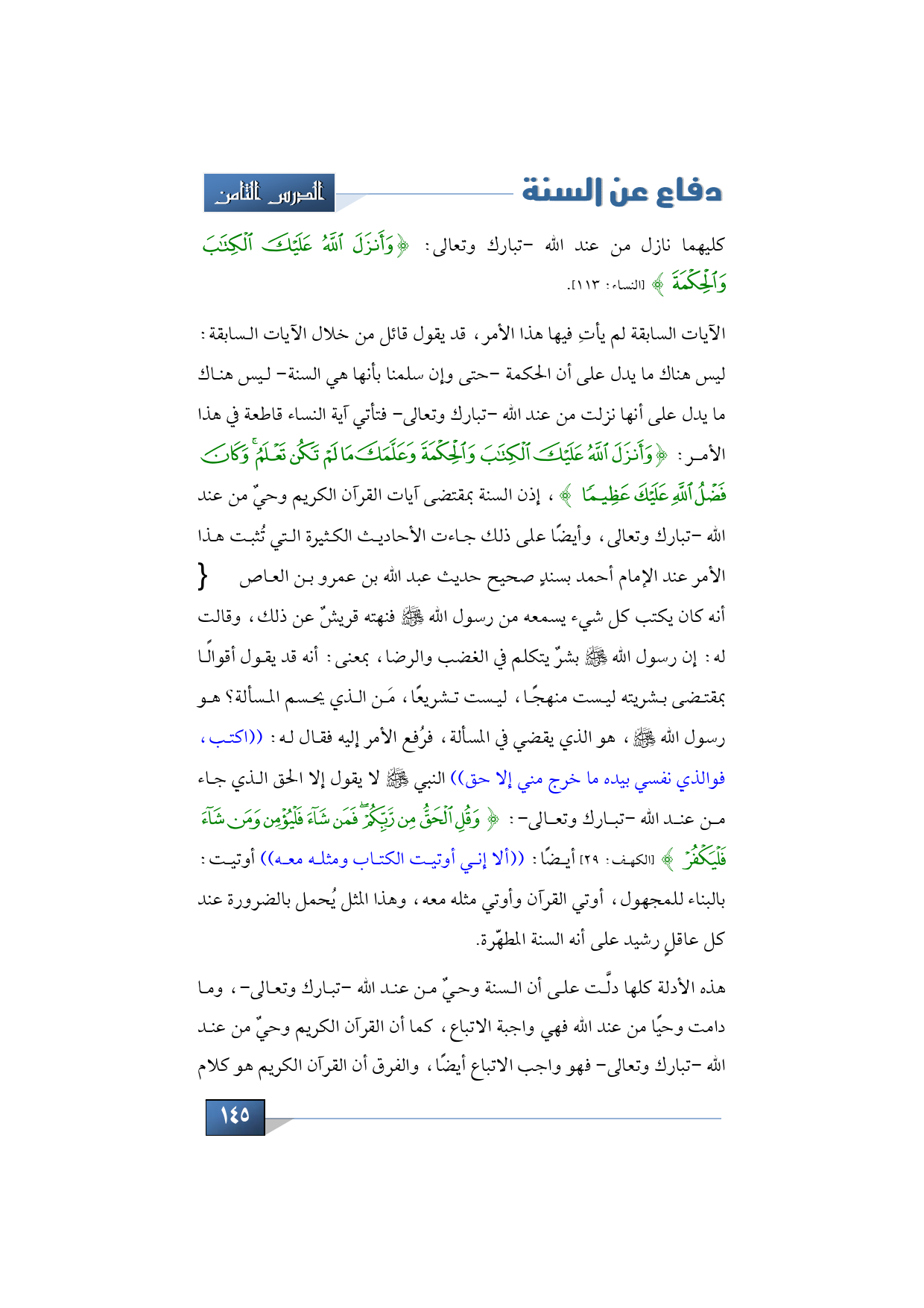 الآيات السابقة لم يأتِ فيها هذا الأمر، قد يقول قائل من خلال الآيات السابقة: ليس هناك ما يدل على أن الحكمة -حتى وإن سلمنا بأنها هي السنة- ليس هناك ما يدل على أنها نزلت من عند الله -تبارك وتعالى- فتأتي آية النساء قاطعة في هذا الأمر: {وَأَنْزَلَ اللَّهُ عَلَيْكَ الْكِتَابَ وَالْحِكْمَةَ وَعَلَّمَكَ مَا لَمْ تَكُنْ تَعْلَمُ وَكَانَ فَضْلُ اللَّهِ عَلَيْكَ عَظِيمًا}، إذن السنة بمقتضى آيات القرآن الكريم وحيٌ من عند الله -تبارك وتعالى، وأيضًا على ذلك جاءت الأحاديث الكثيرة التي تُثبت هذا الأمر عند الإمام أحمد بسندٍ صحيح حديث عبد الله بن عمرو بن العاص -رضي الله تعالى عنهما- أنه كان يكتب كل شيء يسمعه من رسول الله -صلى الله عليه وسلم- فنهته قريشٌ عن ذلك، وقالت له: إن رسول الله -صلى الله عليه وسلم- بشرٌ يتكلم في الغضب والرضا، بمعنى: أنه قد يقول أقوالًا بمقتضى بشريته ليست منهجًا، ليست تشريعًا، مَن الذي يحسم المسألة؟ هو رسول الله -صلى الله عليه وسلم، هو الذي يقضي في المسألة، فرُفع الأمر إليه فقال له: ((اكتب، فوالذي نفسي بيده ما خرج مني إلا حق)) النبي -صلى الله عليه وسلم- لا يقول إلا الحق الذي جاء من عند الله -تبارك وتعالى-: {وَقُلِ الْحَقُّ مِنْ رَبِّكُمْ فَمَنْ شَاءَ فَلْيُؤْمِنْ وَمَنْ شَاءَ فَلْيَكْفُرْ} (الكهف: 29) أيضًا: ((ألا إني أوتيت الكتاب ومثله معه)) أوتيت: بالبناء للمجهول، أوتي القرآن وأوتي مثله معه، وهذا المثل يُحمل بالضرورة عند كل عاقلٍ رشيد على أنه السنة المطهّرة.