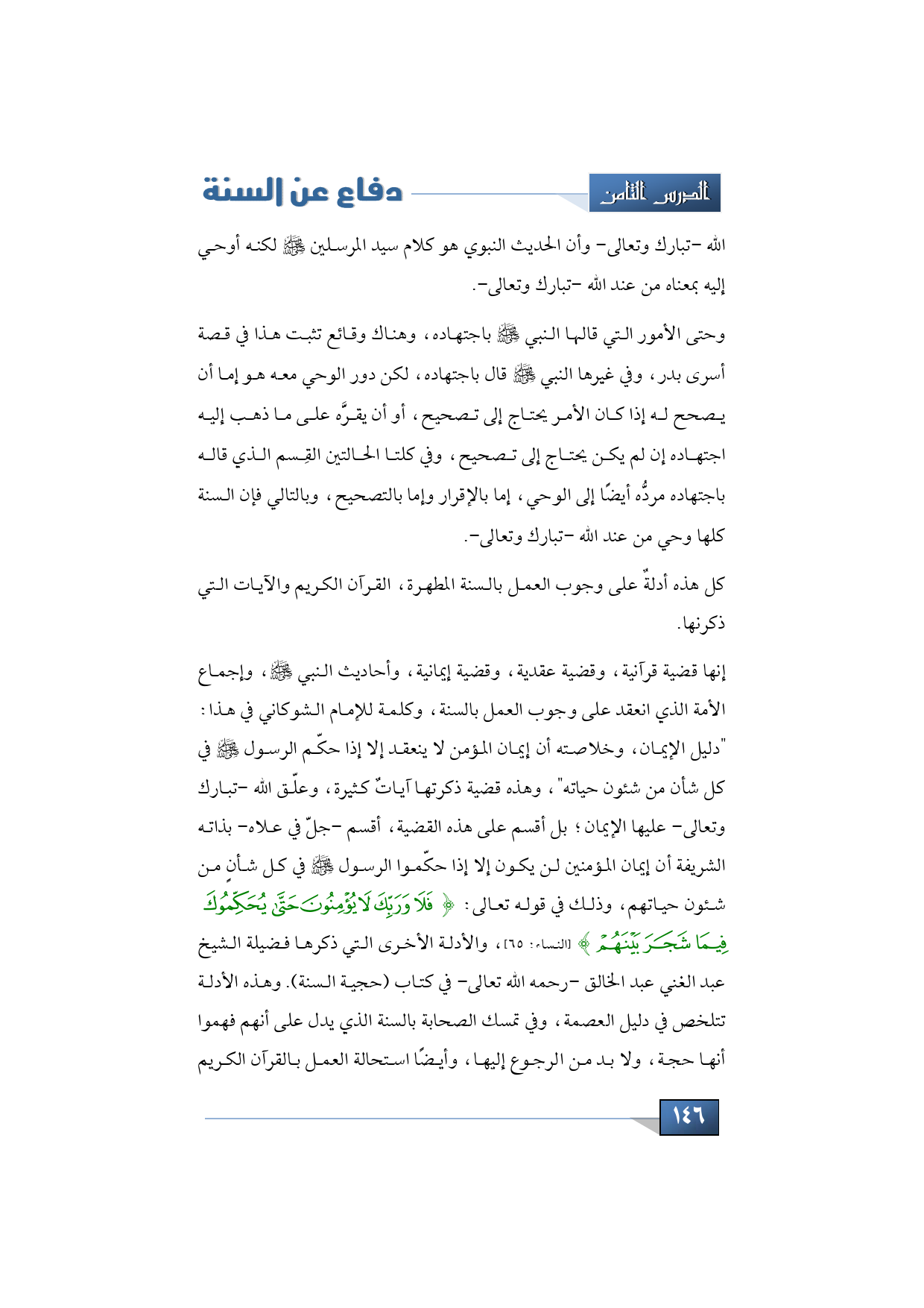 إنها قضية قرآنية، وقضية عقدية، وقضية إيمانية، وأحاديث النبي -صلى الله عليه وسلم، وإجماع الأمة الذي انعقد على وجوب العمل بالسنة، وكلمة للإمام الشوكاني في هذا: "دليل الإيمان، وخلاصته أن إيمان المؤمن لا ينعقد إلا إذا حكّم الرسول -صلى الله عليه وسلم- في كل شأن من شئون حياته"، وهذه قضية ذكرتها آياتٌ كثيرة، وعلّق الله -تبارك وتعالى- عليها الإيمان؛ بل أقسم على هذه القضية، أقسم -جلّ في علاه- بذاته الشريفة أن إيمان المؤمنين لن يكون إلا إذا حكّموا الرسول -صلى الله عليه وسلم- في كل شأنٍ من شئون حياتهم، وذلك في قوله تعالى: {فَلَا وَرَبِّكَ لَا يُؤْمِنُونَ حَتَّى يُحَكِّمُوكَ فِيمَا شَجَرَ بَيْنَهُم} (النساء: 65)، والأدلة الأخرى التي ذكرها فضيلة الشيخ عبد الغني عبد الخالق -رحمه الله تعالى- في كتاب (حجية السنة). وهذه الأدلة تتلخص في دليل العصمة، وفي تمسك الصحابة بالسنة الذي يدل على أنهم فهموا أنها حجة، ولا بد من الرجوع إليها، وأيضًا استحالة العمل بالقرآن الكريم