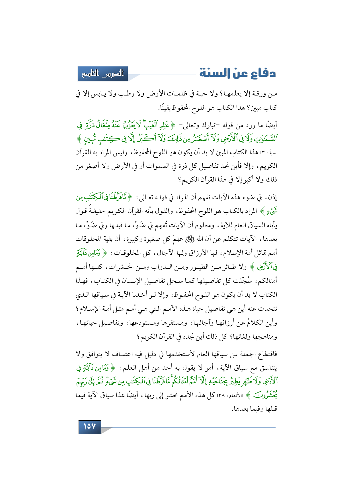 إذن، في ضوء هذه الآيات نفهم أن المراد في قوله تعالى: {مَا فَرَّطْنَا فِي الْكِتَابِ مِنْ شَيْء} المراد بالكتاب هو اللوح المحفوظ، والقول بأنه القرآن الكريم حقيقةً قول يأباه السياق العام للآية، ومعلوم أن الآيات تُفهم في ضَوْء ما قبلها وفي ضَوْء ما بعدها، الآيات تتكلم عن أن الله -عز وجل- علِمَ كل صغيرة وكبيرة، أن بقية المخلوقات أمم تماثل أمة الإسلام، لها الأرزاق ولها الآجال، كل المخلوقات: {وَمَا مِنْ دَابَّةٍ فِي الْأَرْضِ} ولا طائر من الطيور ومن الدواب ومن الحشرات، كلها أمم أمثالكم، سُجّلت كل تفاصيلها كما سجل تفاصيل الإنسان في الكتاب، فهذا الكتاب لا بد أن يكون هو اللوح المحفوظ، وإلا لو أخذنا الآية في سياقها الذي تتحدث عنه أين هي تفاصيل حياة هذه الأمم التي هي أمم مثل أمة الإسلام؟ وأين الكلامُ عن أرزاقها وآجالها، ومستقرها ومستودعها، وتفاصيل حياتها، ومناهجها ولغاتها؟ كل ذلك أين نجده في القرآن الكريم؟