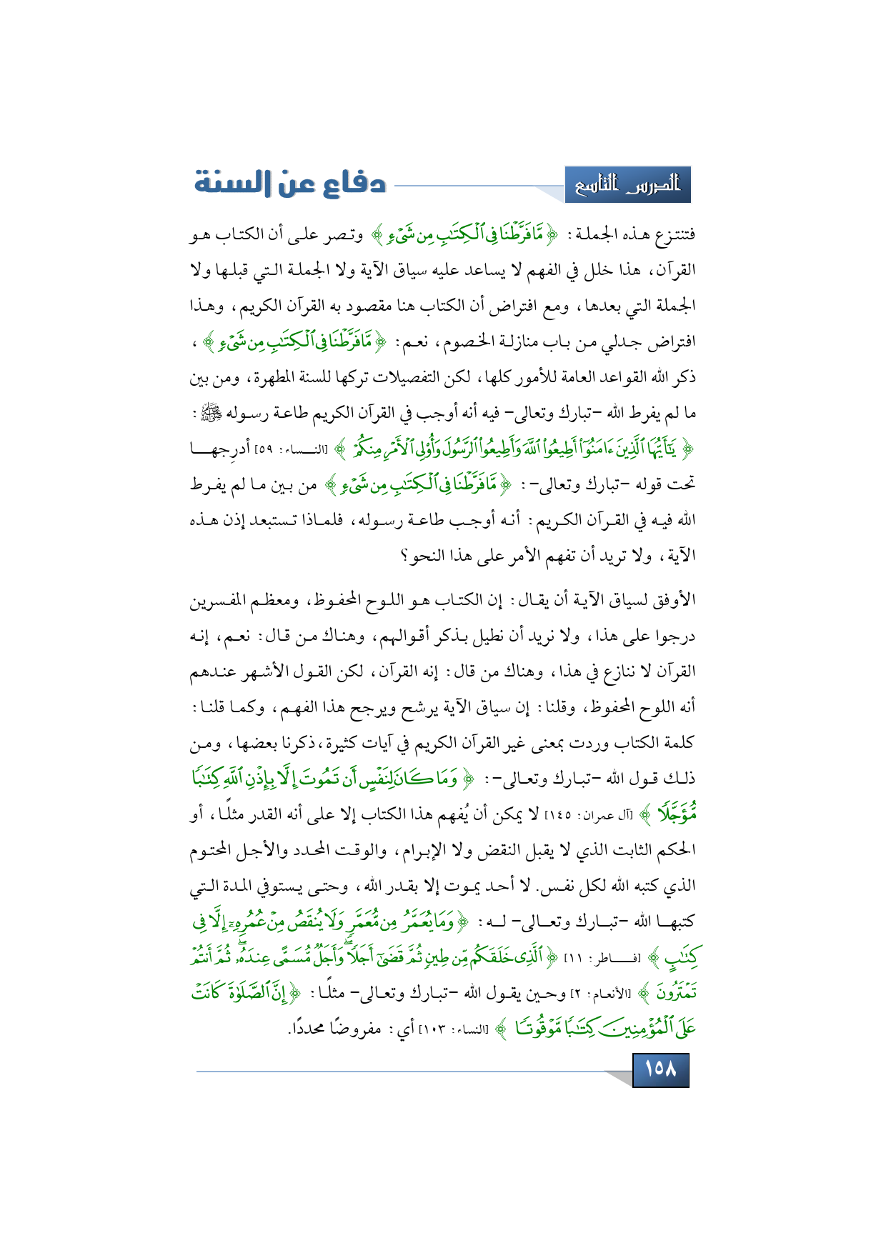 فتنتزع هذه الجملة: {مَا فَرَّطْنَا فِي الْكِتَابِ مِنْ شَيْء} وتصر على أن الكتاب هو القرآن، هذا خلل في الفهم لا يساعد عليه سياق الآية ولا الجملة التي قبلها ولا الجملة التي بعدها، ومع افتراض أن الكتاب هنا مقصود به القرآن الكريم، وهذا افتراض جدلي من باب منازلة الخصوم، نعم: {مَّا فَرَّطْنَا فِي الكِتَابِ مِن شَيْءٍ}، ذكر الله القواعد العامة للأمور كلها، لكن التفصيلات تركها للسنة المطهرة، ومن بين ما لم يفرط الله -تبارك وتعالى- فيه أنه أوجب في القرآن الكريم طاعة رسوله -صلى الله عليه وسلم-: {يَا أَيُّهَا الَّذِينَ آمَنُوا أَطِيعُوا اللَّهَ وَأَطِيعُوا الرَّسُولَ وَأُولِي الْأَمْرِ مِنْكُمْ} (النساء: 59) أدرِجها تحت قوله -تبارك وتعالى-: {مَا فَرَّطْنَا فِي الْكِتَابِ مِنْ شَيْء} من بين ما لم يفرط الله فيه في القرآن الكريم: أنه أوجب طاعة رسوله، فلماذا تستبعد إذن هذه الآية، ولا تريد أن تفهم الأمر على هذا النحو؟