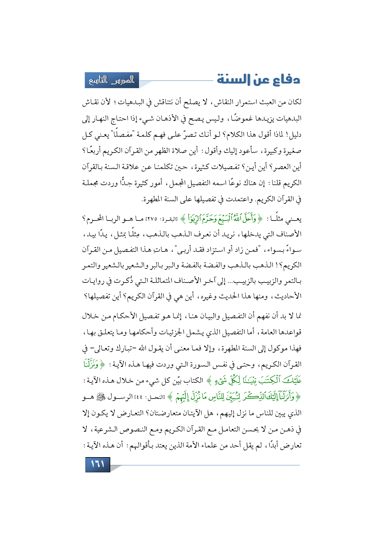 لكان من العبث استمرار النقاش، لا يصلح أن نتناقش في البدهيات؛ لأن نقاش البدهيات يزيدها غموضًا، وليس يصح في الأذهان شيء إذا احتاج النهار إلى دليل! لماذا أقول هذا الكلام؟ لو أنك تصرّ على فهم كلمة "مفصلًا" يعني كل صغيرة وكبيرة، سأعود إليك وأقول: أين صلاة الظهر من القرآن الكريم أربعًا؟ أين العصر؟ أين أين؟ تفصيلات كثيرة، حين تكلمنا عن علاقة السنة بالقرآن الكريم قلنا: إن هناك نوعًا اسمه التفصيل المجمل، أمور كثيرة جدًّا وردت مجملة في القرآن الكريم. واعتمدت في تفصيلها على السنة المطهرة.