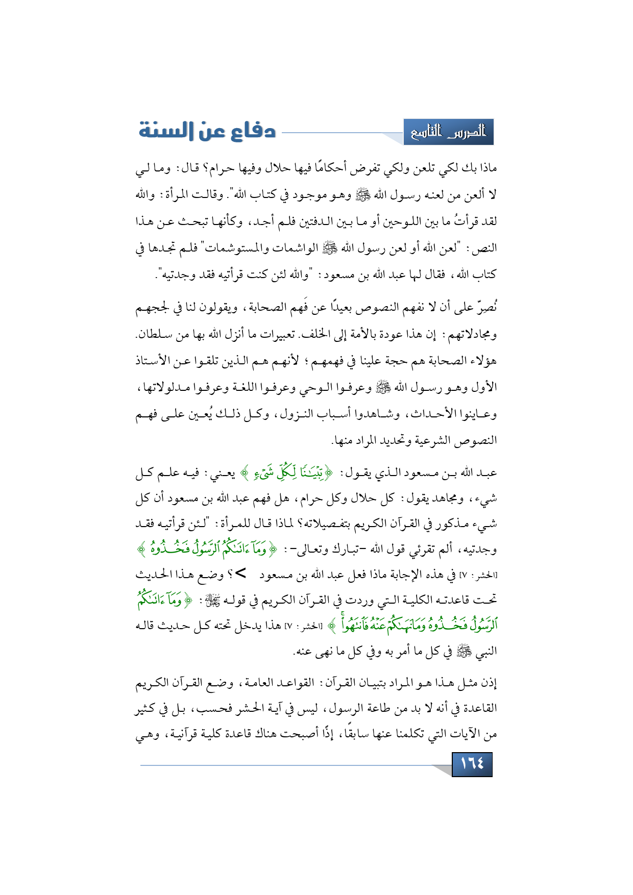عبد الله بن مسعود الذي يقول: {تِبْيَانًا لِكُلِّ شَيْءٍ} يعني: فيه علم كل شيء، ومجاهد يقول: كل حلال وكل حرام، هل فهم عبد الله بن مسعود أن كل شيء مذكور في القرآن الكريم بتفصيلاته؟ لماذا قال للمرأة: "لئن قرأتيه فقد وجدتيه، ألم تقرأي قول الله -تبارك وتعالى-: {وَمَا آتَاكُمُ الرَّسُولُ فَخُذُوهُ} " (الحشر: 7) في هذه الإجابة ماذا فعل عبد الله بن مسعود -رضي الله تعالى عنه-؟ وضع هذا الحديث تحت قاعدته الكلية التي وردت في القرآن الكريم في قوله -سبحانه وتعالى-: {وَمَا آتَاكُمُ الرَّسُولُ فَخُذُوهُ وَمَا نَهَاكُمْ عَنْهُ فَانْتَهُوا} (الحشر: 7) هذا يدخل تحته كل حديث قاله النبي -صلى الله عليه وسلم- في كل ما أمر به وفي كل ما نهى عنه.