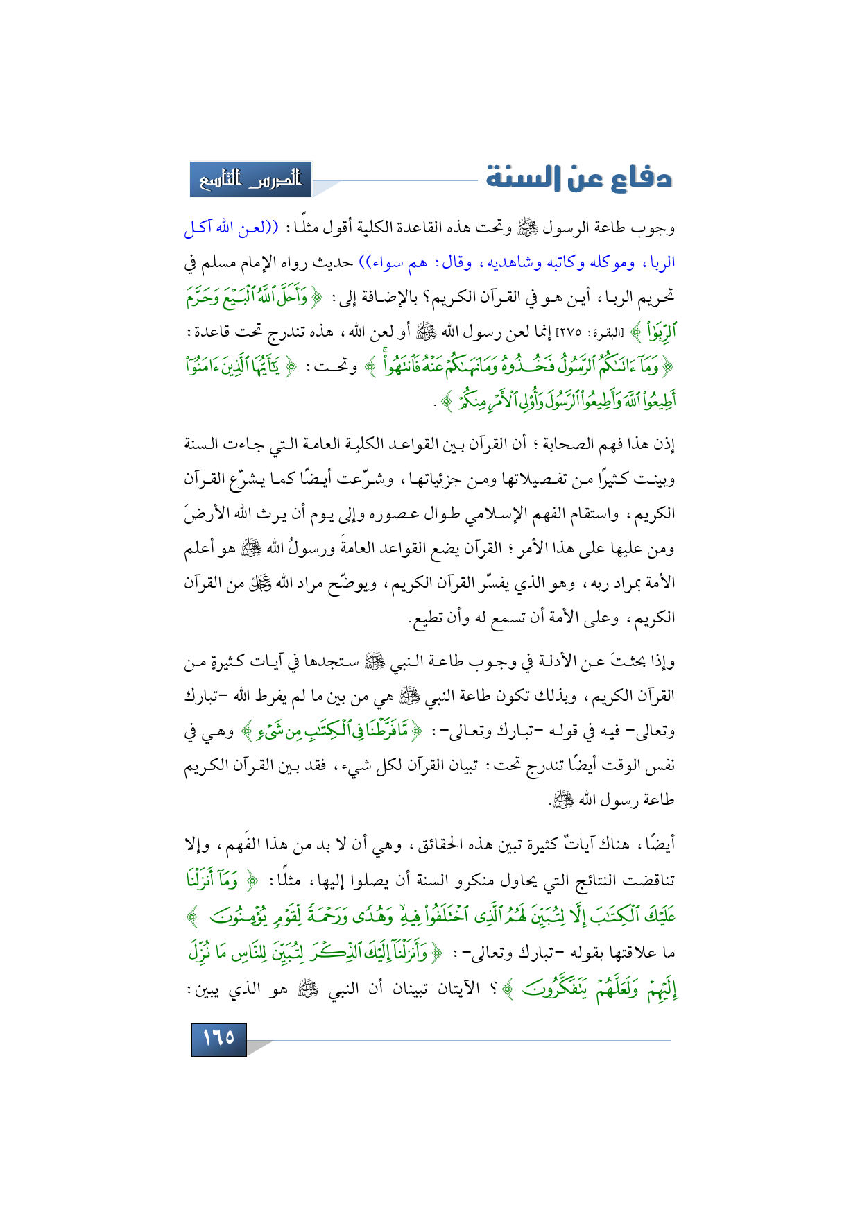 وجوب طاعة الرسول -صلى الله عليه وسلم- وتحت هذه القاعدة الكلية أقول مثلًا: ((لعن الله آكل الربا، وموكله وكاتبه وشاهديه، وقال: هم سواء)) حديث رواه الإمام مسلم في تحريم الربا، أين هو في القرآن الكريم؟ بالإضافة إلى: {وَأَحَلَّ اللَّهُ الْبَيْعَ وَحَرَّمَ الرِّبَا} (البقرة: 275) إنما لعن رسول الله -صلى الله عليه وسلم- أو لعن الله، هذه تندرج تحت قاعدة: {وَمَا آتَاكُمُ الرَّسُولُ فَخُذُوهُ وَمَا نَهَاكُمْ عَنْهُ فَانْتَهُوا} وتحت: {يَا أَيُّهَا الَّذِينَ آمَنُوا أَطِيعُوا اللَّهَ وَأَطِيعُوا الرَّسُولَ وَأُولِي الْأَمْرِ مِنْكُمْ}.