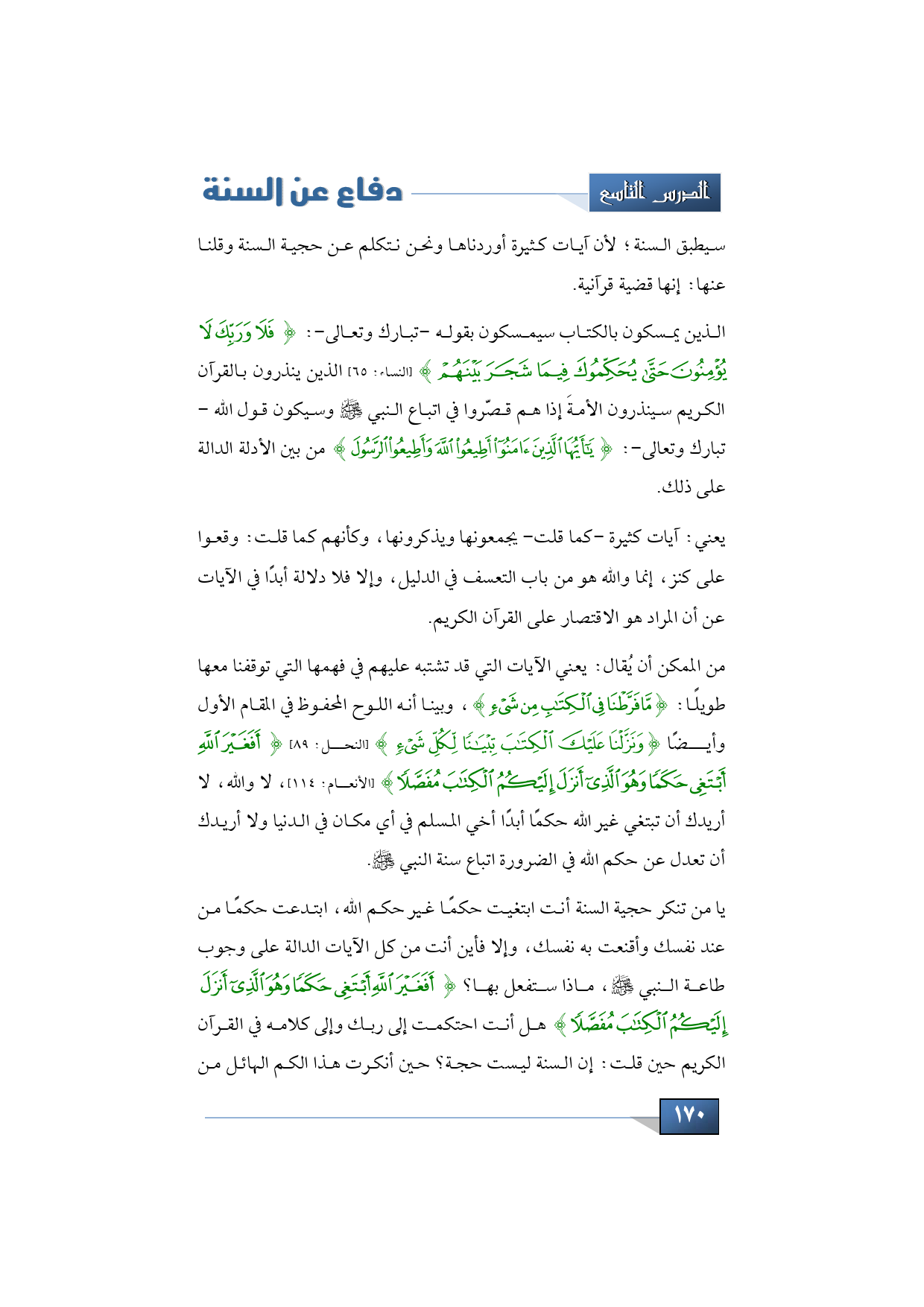 من الممكن أن يُقال: يعني الآيات التي قد تشتبه عليهم في فهمها التي توقفنا معها طويلًا: {مَّا فَرَّطْنَا فِي الكِتَابِ مِن شَيْءٍ}، وبينا أنه اللوح المحفوظ في المقام الأول وأيضًا {وَنَزَّلْنَا عَلَيْكَ الْكِتَابَ تِبْيَانًا لِكُلِّ شَيْءٍ} (النحل: 89) {أَفَغَيْرَ اللَّهِ أَبْتَغِي حَكَمًا وَهُوَ الَّذِي أَنْزَلَ إِلَيْكُمُ الْكِتَابَ مُفَصَّلًا} (الأنعام: 114)، لا والله، لا أريدك أن تبتغي غير الله حكمًا أبدًا أخي المسلم في أي مكان في الدنيا ولا أريدك أن تعدل عن حكم الله في الضرورة اتباع سنة النبي -صلى الله عليه وسلم-.