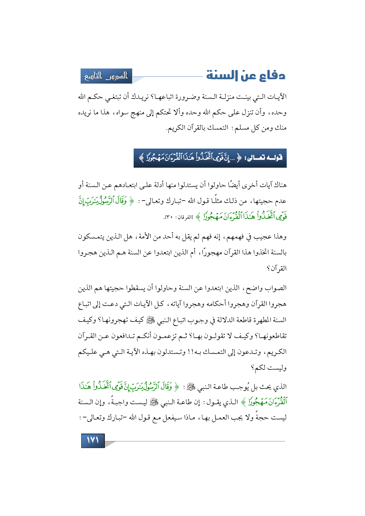هناك آيات أخرى أيضًا حاولوا أن يستدلوا منها أدلة على ابتعادهم عن السنة أو عدم حجيتها، من ذلك مثلًا قول الله -تبارك وتعالى-: {وَقَالَ الرَّسُولُ يَا رَب إِنَّ قَوْمِي اتَّخَذُوا هَذَا الْقُرْآنَ مَهْجُورًا} (الفرقان: 30).