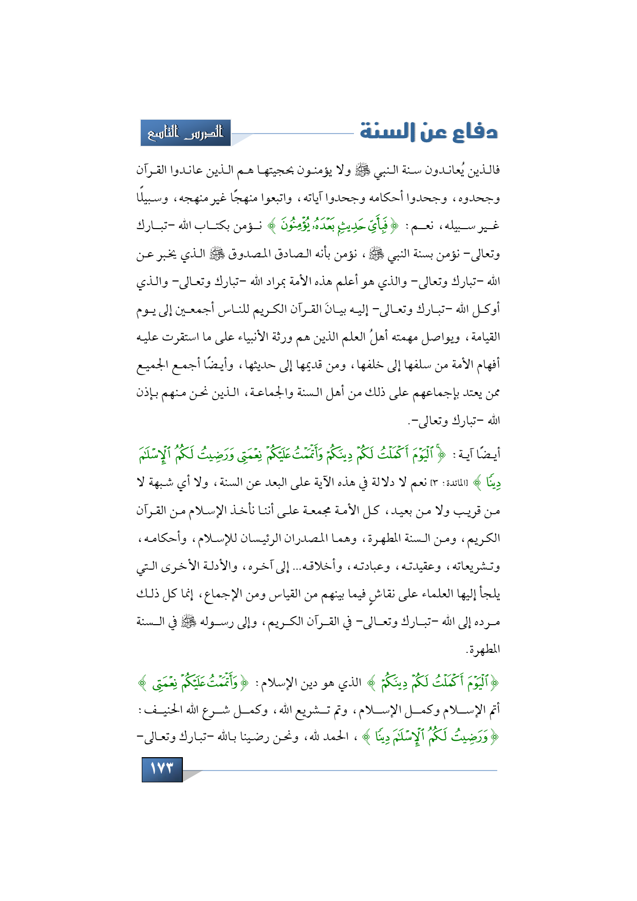 أيضًا آية: {الْيَوْمَ أَكْمَلْتُ لَكُمْ دِينَكُمْ وَأَتْمَمْتُ عَلَيْكُمْ نِعْمَتِي وَرَضِيتُ لَكُمُ الْإِسْلَامَ دِينًا} (المائدة: 3) نعم لا دلالة في هذه الآية على البعد عن السنة، ولا أي شبهة لا من قريب ولا من بعيد، كل الأمة مجمعة على أننا نأخذ الإسلام من القرآن الكريم، ومن السنة المطهرة، وهما المصدران الرئيسان للإسلام، وأحكامه، وتشريعاته، وعقيدته، وعبادته، وأخلاقه ... إلى آخره، والأدلة الأخرى التي يلجأ إليها العلماء على نقاشٍ فيما بينهم من القياس ومن الإجماع، إنما كل ذلك مرده إلى الله -تبارك وتعالى- في القرآن الكريم، وإلى رسوله -صلى الله عليه وسلم- في السنة المطهرة.