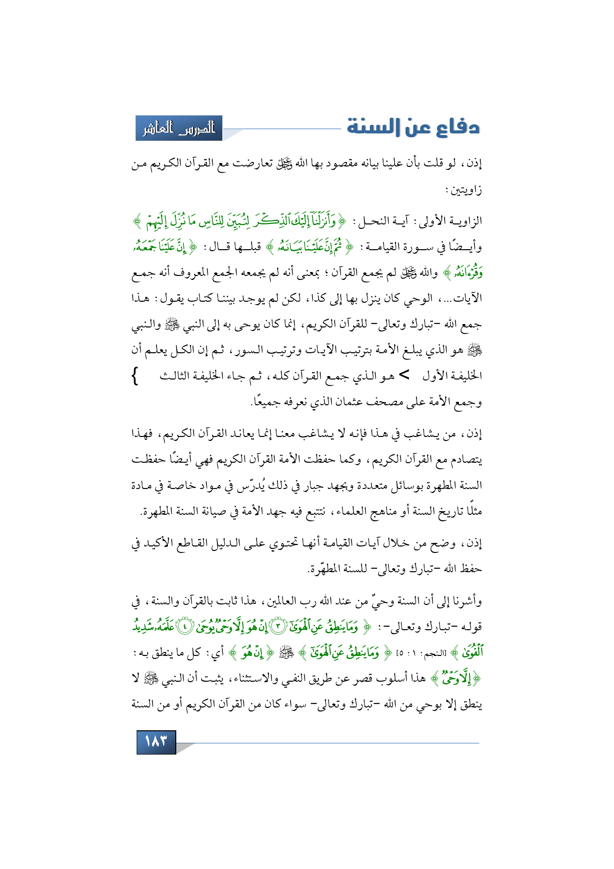 وأشرنا إلى أن السنة وحيٌ من عند الله رب العالمين، هذا ثابت بالقرآن والسنة، في قوله -تبارك وتعالى-: {وَالنَّجْمِ إِذَا هَوَى * مَا ضَلَّ صَاحِبُكُمْ وَمَا غَوَى * وَمَا يَنْطِقُ عَنِ الْهَوَى * إِنْ هُوَ إِلَّا وَحْيٌ يُوحَى * عَلَّمَهُ شَدِيدُ الْقُوَى} (النجم: 1: 5) {وَمَا يَنْطِقُ عَنِ الْهَوَى} -صلى الله عليه وسلم- {إِنْ هُوَ} أي: كل ما ينطق به: {إِلَّا وَحْيٌ} هذا أسلوب قصر عن طريق النفي والاستثناء، يثبت أن النبي -صلى الله عليه وسلم- لا ينطق إلا بوحي من الله -تبارك وتعالى- سواء كان من القرآن الكريم أو من السنة