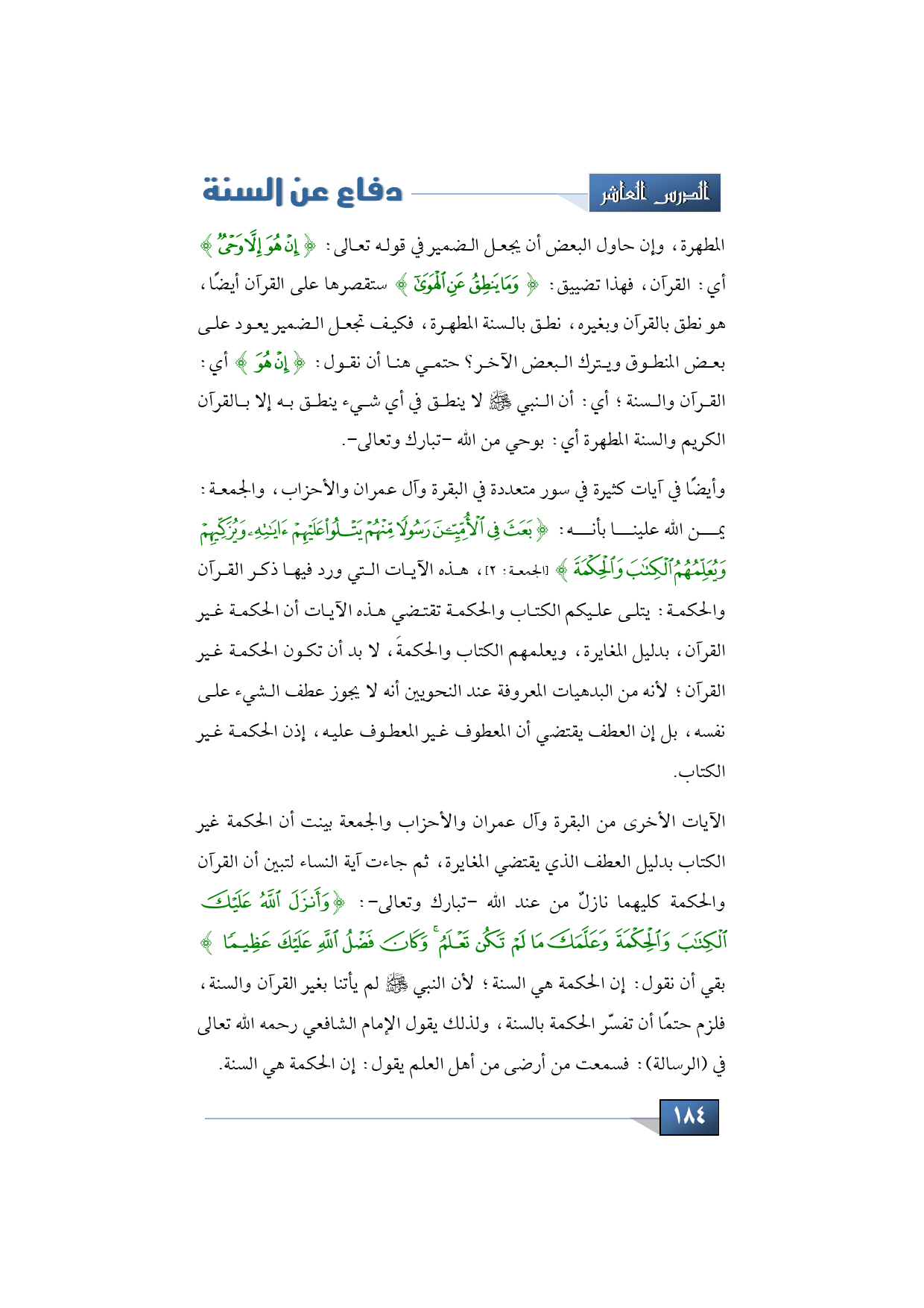 المطهرة، وإن حاول البعض أن يجعل الضمير في قوله تعالى: {إِنْ هُوَ إِلَّا وَحْيٌ} أي: القرآن، فهذا تضييق: {وَمَا يَنْطِقُ عَنِ الْهَوَى} ستقصرها على القرآن أيضًا، هو نطق بالقرآن وبغيره، نطق بالسنة المطهرة، فكيف تجعل الضمير يعود على بعض المنطوق ويترك البعض الآخر؟ حتمي هنا أن نقول: {إِنْ هُوَ} أي: القرآن والسنة؛ أي: أن النبي -صلى الله عليه وسلم- لا ينطق في أي شيء ينطق به إلا بالقرآن الكريم والسنة المطهرة أي: بوحي من الله -تبارك وتعالى-.