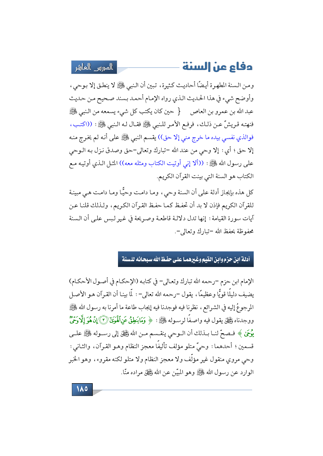 ومن السنة المطهرة أيضًا أحاديث كثيرة، تبين أن النبي -صلى الله عليه وسلم- لا ينطق إلا بوحي، وأوضح شيء في هذا الحديث الذي رواه الإمام أحمد بسند صحيح من حديث عبد الله بن عمرو بن العاص -رضي الله تعالى عنهما- حين كان يكتب كل شيء يسمعه من النبي -صلى الله عليه وسلم- فنهته قريشٌ عن ذلك، فرفع الأمر للنبي -صلى الله عليه وسلم- فقال له النبي -صلى الله عليه وسلم-: ((اكتب، فوالذي نفسي بيده ما خرج مني إلا حق)) يقسم النبي -صلى الله عليه وسلم- على أنه لم يخرج منه إلا حق؛ أي: إلا وحي من عند الله -تبارك وتعالى-حق وصدق نزل به الوحي على رسول الله -صلى الله عليه وسلم-: ((ألا إني أوتيت الكتاب ومثله معه)) المثل الذي أوتيه مع الكتاب هو السنة التي بينت القرآن الكريم.