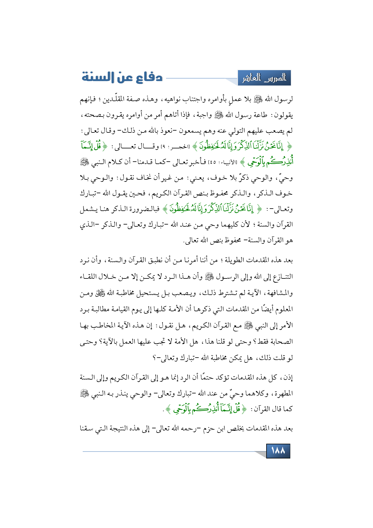 لرسول الله -صلى الله عليه وسلم- بلا عملٍ بأوامره واجتناب نواهيه، وهذه صفة المقلّدين؛ فإنهم يقولون: طاعة رسول الله -صلى الله عليه وسلم- واجبة، فإذا أتاهم أمر من أوامره يقرون بصحته، لم يصعب عليهم التولي عنه وهم يسمعون -نعوذ بالله من ذلك- وقال تعالى: {إِنَّا نَحْنُ نَزَّلْنَا الذِّكْرَ وَإِنَّا لَهُ لَحَافِظُونَ} (الحجر: 9) وقال تعالى: {قُلْ إِنَّمَا أُنْذِرُكُمْ بِالْوَحْيِ} (الأنبياء: 45) فأخبر تعالى -كما قدمنا- أن كلام النبي -صلى الله عليه وسلم- وحيٌ، والوحي ذكرٌ بلا خوف، يعني: من غير أن نخاف نقول: والوحي بلا خوف الذكر، والذكر محفوظ بنص القرآن الكريم، فحين يقول الله -تبارك وتعالى-: {إِنَّا نَحْنُ نَزَّلْنَا الذِّكْرَ وَإِنَّا لَهُ لَحَافِظُونَ} فبالضرورة الذكر هنا يشمل القرآن والسنة؛ لأن كليهما وحي من عند الله -تبارك وتعالى- والذكر -الذي هو القرآن والسنة- محفوظ بنص الله تعالى.