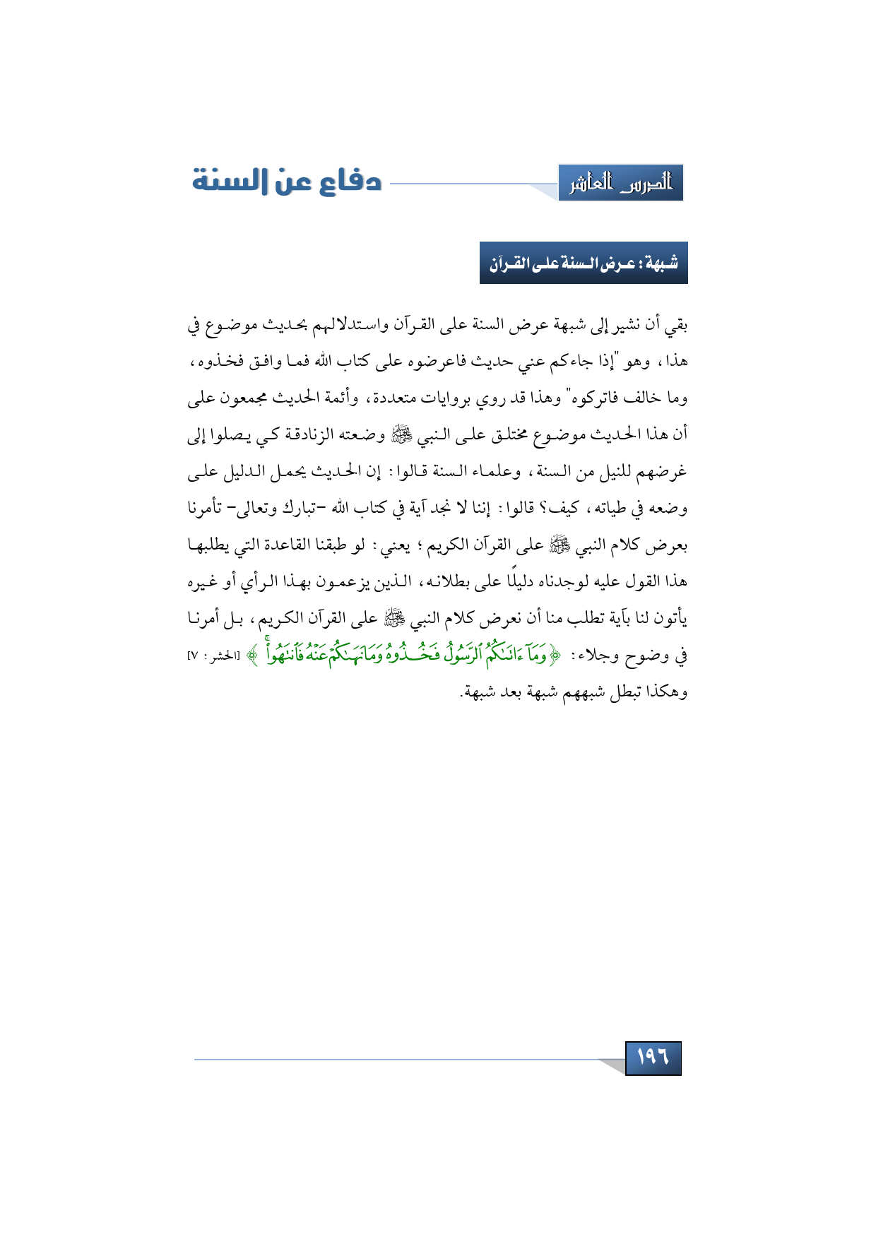 بقي أن نشير إلى شبهة عرض السنة على القرآن واستدلالهم بحديث موضوع في هذا، وهو "إذا جاءكم عني حديث فاعرضوه على كتاب الله فما وافق فخذوه، وما خالف فاتركوه" وهذا قد روي بروايات متعددة، وأئمة الحديث مجمعون على أن هذا الحديث موضوع مختلق على النبي -صلى الله عليه وسلم- وضعته الزنادقة كي يصلوا إلى غرضهم للنيل من السنة، وعلماء السنة قالوا: إن الحديث يحمل الدليل على وضعه في طياته، كيف؟ قالوا: إننا لا نجد آية في كتاب الله -تبارك وتعالى- تأمرنا بعرض كلام النبي -صلى الله عليه وسلم- على القرآن الكريم؛ يعني: لو طبقنا القاعدة التي يطلبها هذا القول عليه لوجدناه دليلًا على بطلانه، الذين يزعمون بهذا الرأي أو غيره يأتون لنا بآية تطلب منا أن نعرض كلام النبي -صلى الله عليه وسلم- على القرآن الكريم، بل أمرنا في وضوح وجلاء: {وَمَا آتَاكُمُ الرَّسُولُ فَخُذُوهُ وَمَا نَهَاكُمْ عَنْهُ فَانْتَهُوا} (الحشر: 7) وهكذا تبطل شبههم شبهة بعد شبهة.