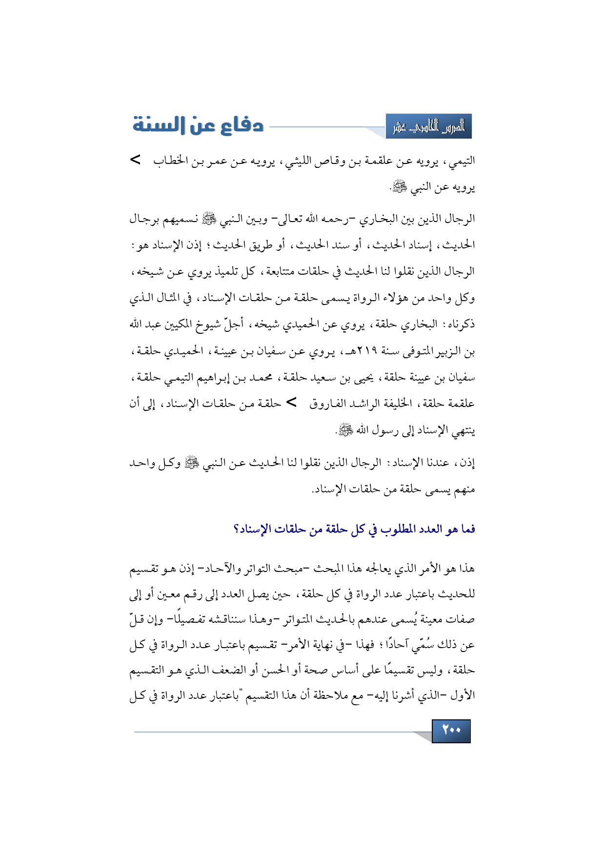 إذن، عندنا الإسناد: الرجال الذين نقلوا لنا الحديث عن النبي -صلى الله عليه وسلم- وكل واحد منهم يسمى حلقة من حلقات الإسناد.
