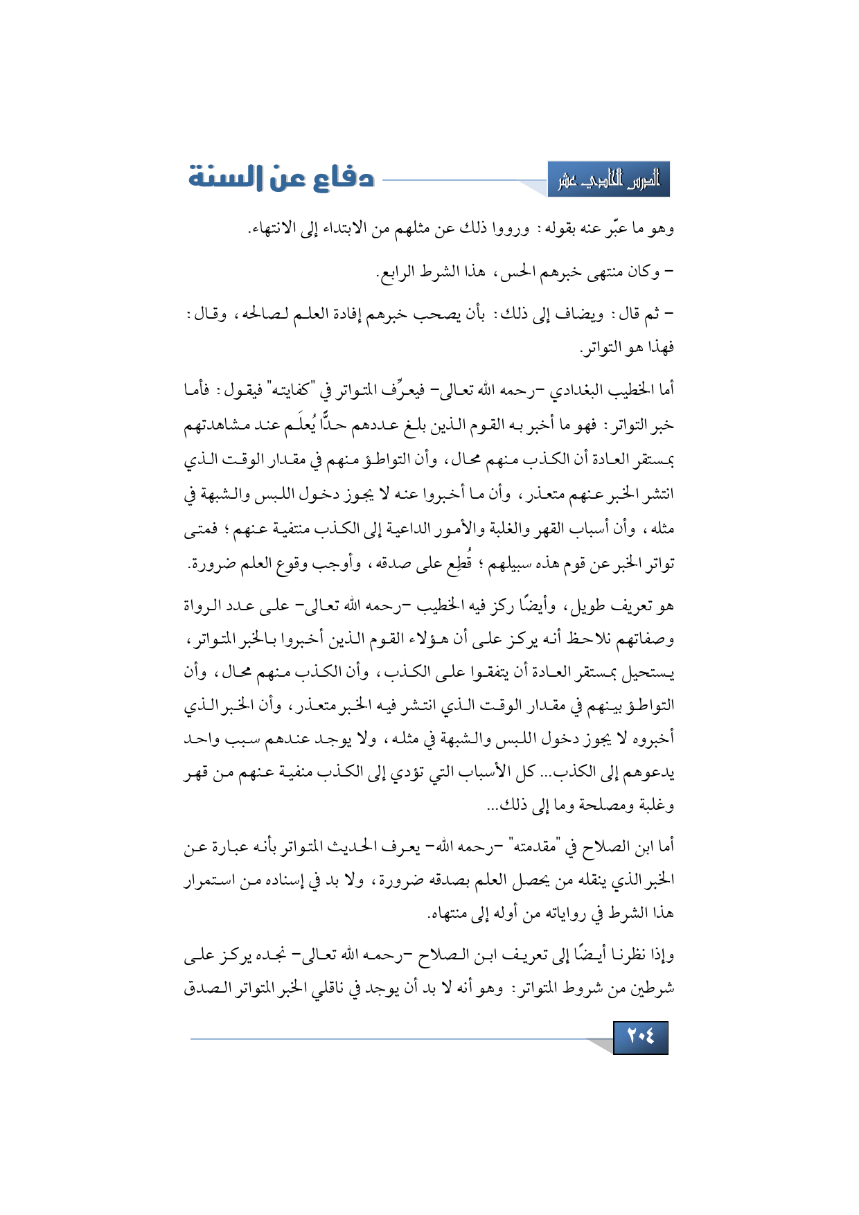 أما ابن الصلاح في "مقدمته" -رحمه الله- يعرف الحديث المتواتر بأنه عبارة عن الخبر الذي ينقله من يحصل العلم بصدقه ضرورة، ولا بد في إسناده من استمرار هذا الشرط في رواياته من أوله إلى منتهاه.