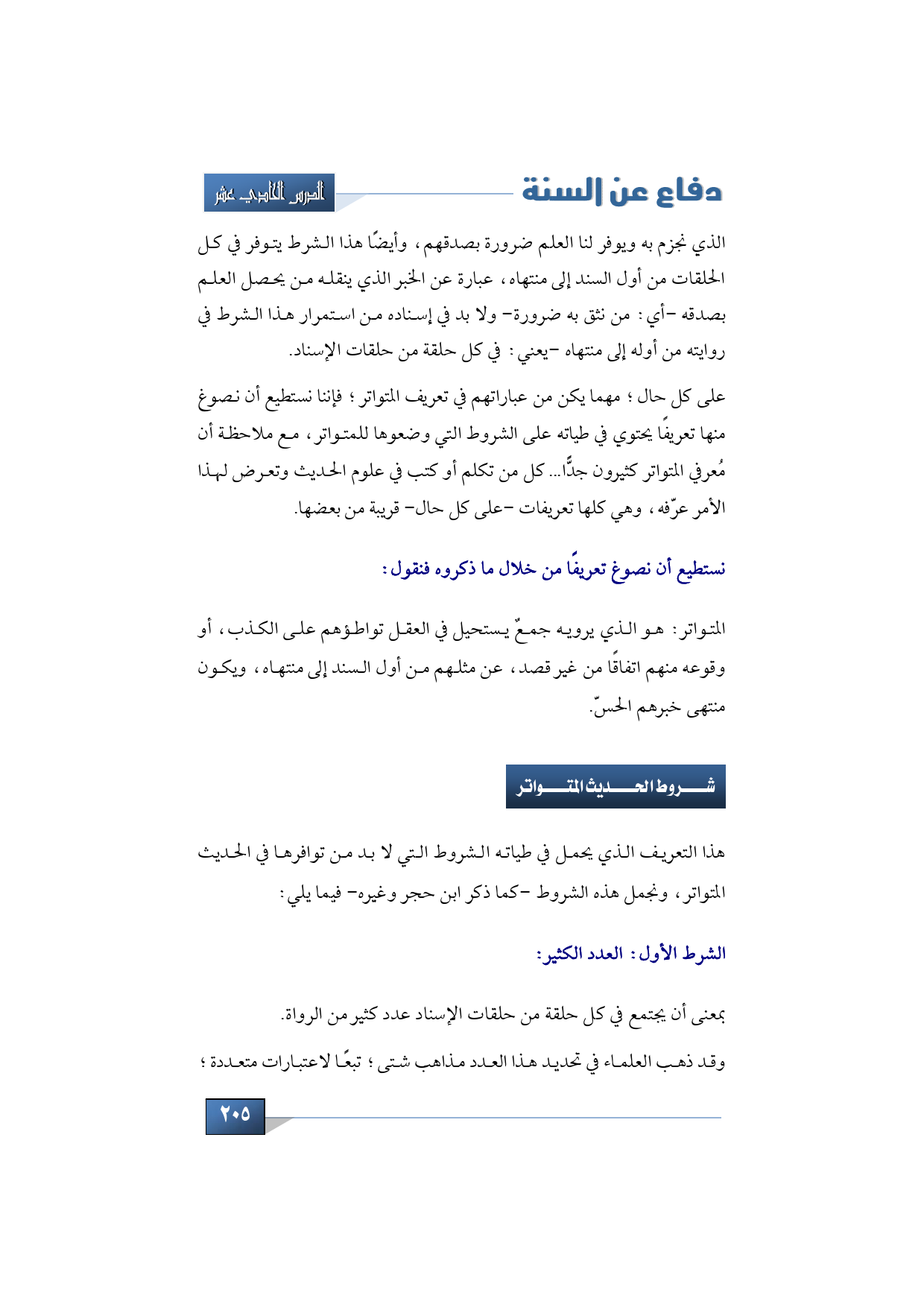 الذي نجزم به ويوفر لنا العلم ضرورة بصدقهم، وأيضًا هذا الشرط يتوفر في كل الحلقات من أول السند إلى منتهاه، عبارة عن الخبر الذي ينقله من يحصل العلم بصدقه -أي: من نثق به ضرورة- ولا بد في إسناده من استمرار هذا الشرط في روايته من أوله إلى منتهاه -يعني: في كل حلقة من حلقات الإسناد.