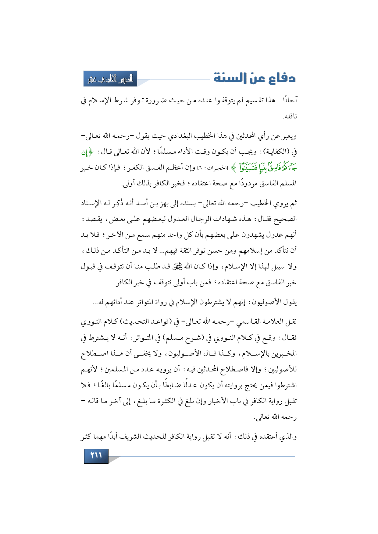 نقل العلامة القاسمي -رحمه الله تعالى- في (قواعد التحديث) كلام النووي فقال: وقع في كلام النووي في (شرح مسلم) في المتواتر: أنه لا يشترط في المخبرين بالإسلام، وكذا قال الأصوليون، ولا يخفى أن هذا اصطلاح للأصوليين؛ وإلا فاصطلاح المحدثين فيه: أن يرويه عدد من المسلمين؛ لأنهم اشترطوا فيمن يحتج بروايته أن يكون عدلًا ضابطًا بأن يكون مسلمًا بالغًا؛ فلا تقبل رواية الكافر في باب الأخبار وإن بلغ في الكثرة ما بلغ، إلى آخر ما قاله -رحمه الله تعالى.