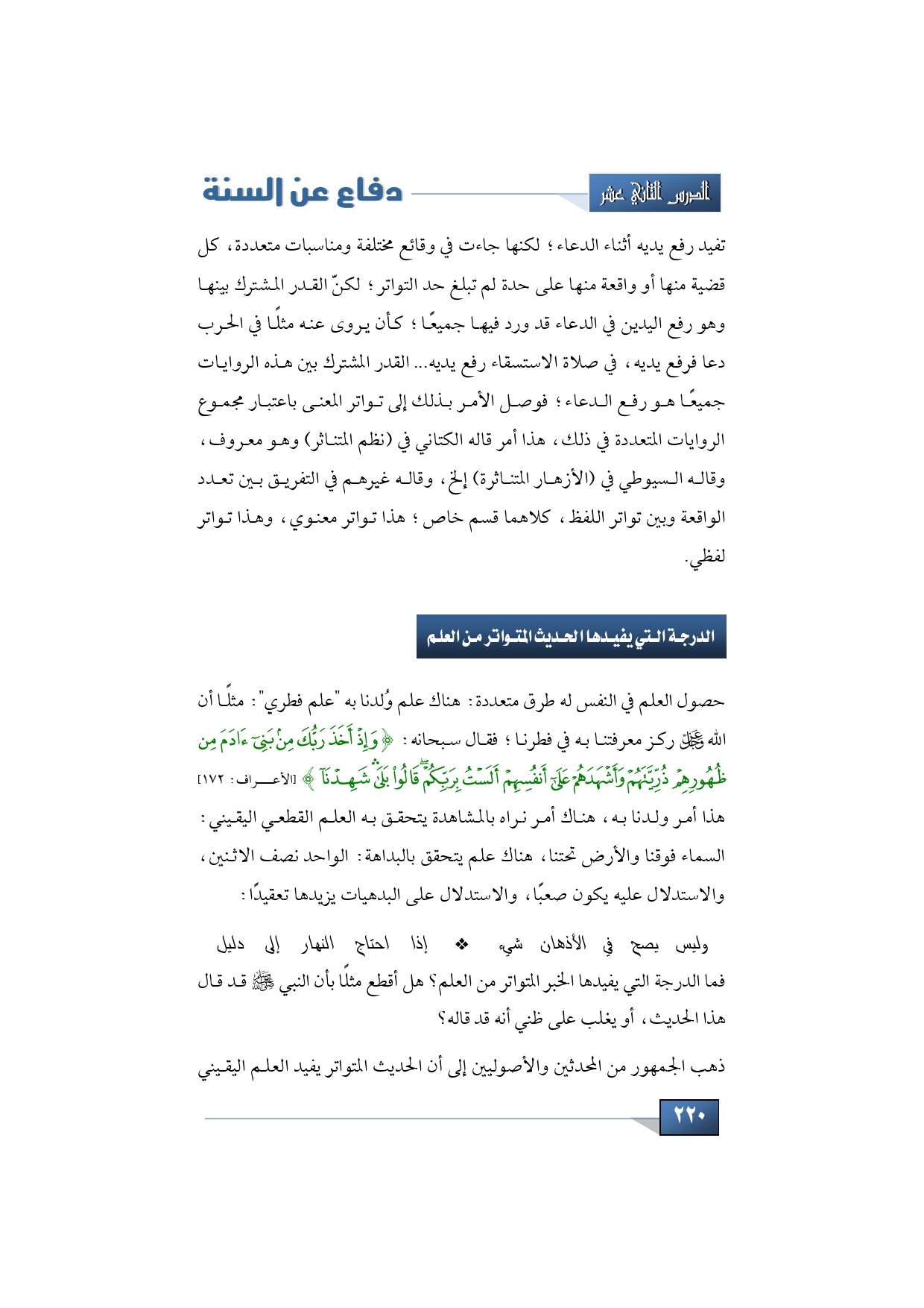 تفيد رفع يديه أثناء الدعاء؛ لكنها جاءت في وقائع مختلفة ومناسبات متعددة، كل قضية منها أو واقعة منها على حدة لم تبلغ حد التواتر؛ لكنّ القدر المشترك بينها وهو رفع اليدين في الدعاء قد ورد فيها جميعًا؛ كأن يروى عنه مثلًا في الحرب دعا فرفع يديه، في صلاة الاستسقاء رفع يديه ... القدر المشترك بين هذه الروايات جميعًا هو رفع الدعاء؛ فوصل الأمر بذلك إلى تواتر المعنى باعتبار مجموع الروايات المتعددة في ذلك، هذا أمر قاله الكتاني في (نظم المتناثر) وهو معروف، وقاله السيوطي في (الأزهار المتناثرة) إلخ، وقاله غيرهم في التفريق بين تعدد الواقعة وبين تواتر اللفظ، كلاهما قسم خاص؛ هذا تواتر معنوي، وهذا تواتر لفظي.