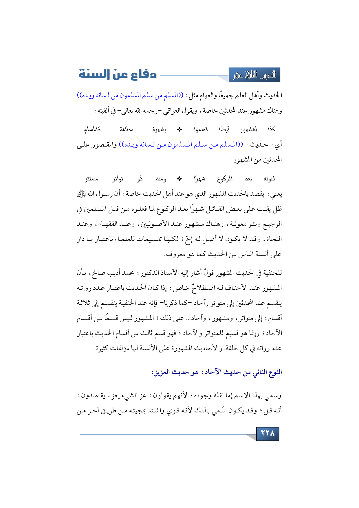 للحنفية في الحديث المشهور قولٌ أشار إليه الأستاذ الدكتور: محمد أديب صالح، بأن المشهور عند الأحناف له اصطلاحٌ خاص: إذا كان الحديث باعتبار عدد رواته ينقسم عند المحدثين إلى متواتر وآحاد -كما ذكرنا- فإنه عند الحنفية ينقسم إلى ثلاثة أقسام: إلى متواتر، ومشهور، وآحاد ... على ذلك؛ المشهور ليس قسمًا من أقسام الآحاد؛ وإنما هو قسيم للمتواتر والآحاد؛ فهو قسم ثالث من أقسام الحديث باعتبار عدد رواته في كل حلقة.