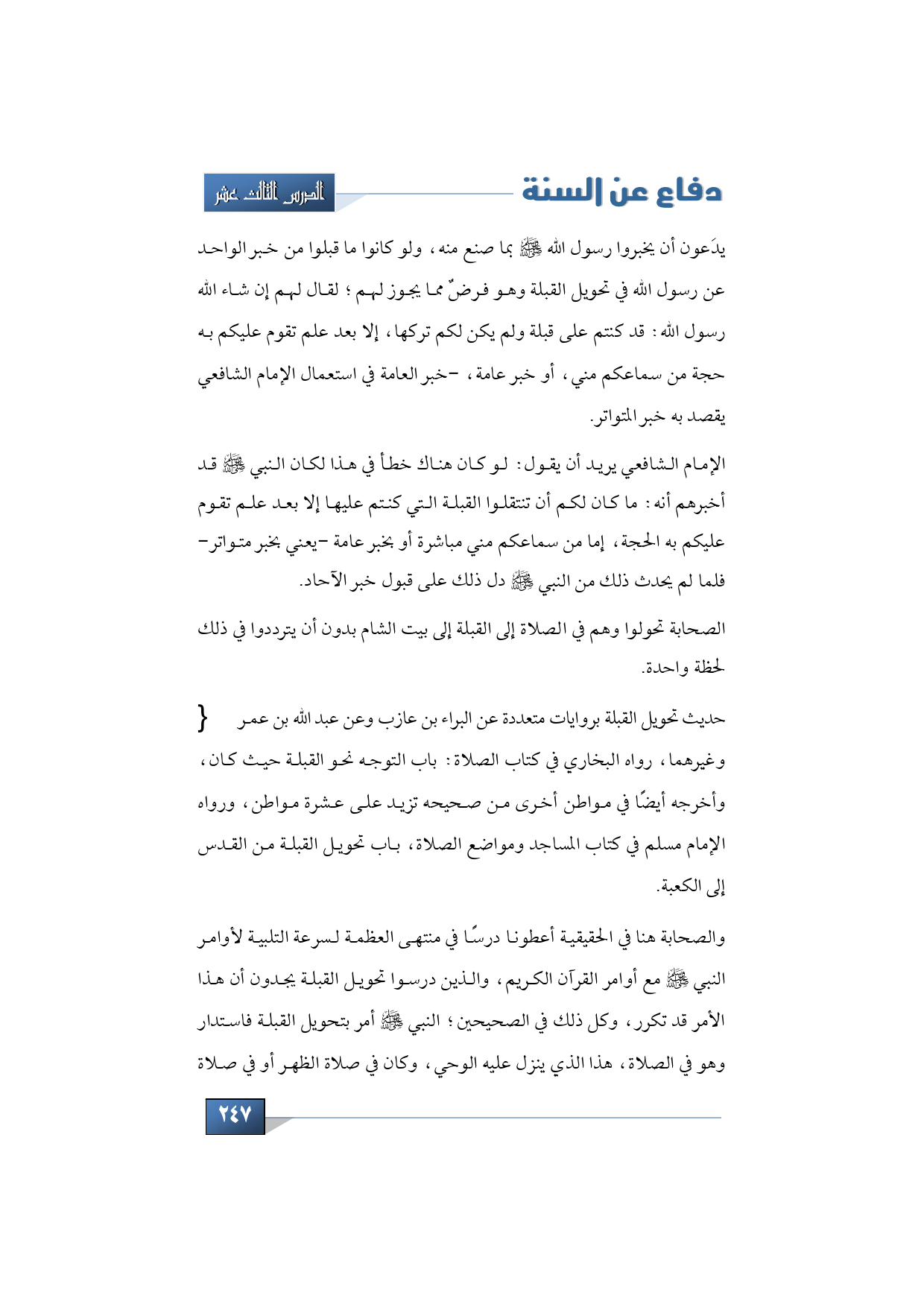 الإمام الشافعي يريد أن يقول: لو كان هناك خطأ في هذا لكان النبي -صلى الله عليه وسلم- قد أخبرهم أنه: ما كان لكم أن تنتقلوا القبلة التي كنتم عليها إلا بعد علم تقوم عليكم به الحجة، إما من سماعكم مني مباشرة أو بخبر عامة -يعني بخبر متواتر- فلما لم يحدث ذلك من النبي -صلى الله عليه وسلم- دل ذلك على قبول خبر الآحاد.