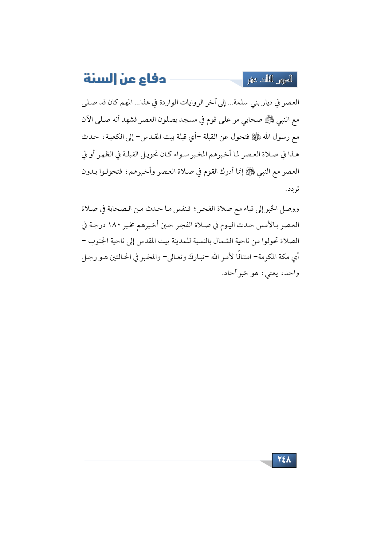 العصر في ديار بني سلمة ... إلى آخر الروايات الواردة في هذا ... المهم كان قد صلى مع النبي -صلى الله عليه وسلم- صحابي مر على قوم في مسجد يصلون العصر فشهد أنه صلى الآن مع رسول الله -صلى الله عليه وسلم- فتحول عن القبلة -أي قبلة بيت المقدس- إلى الكعبة، حدث هذا في صلاة العصر لما أخبرهم المخبر سواء كان تحويل القبلة في الظهر أو في العصر مع النبي -صلى الله عليه وسلم- إنما أدرك القوم في صلاة العصر وأخبرهم؛ فتحولوا بدون تردد.