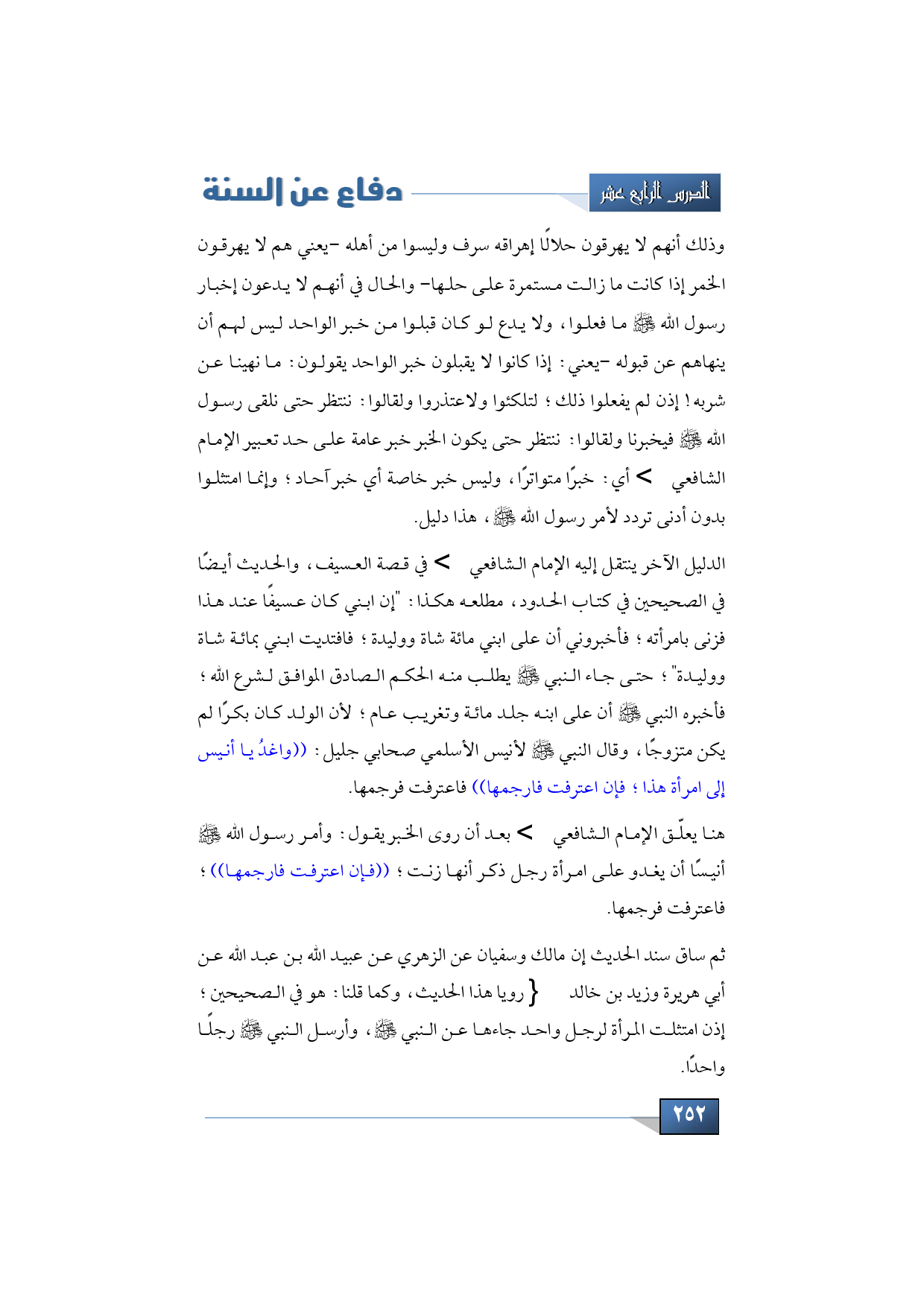 الدليل الآخر ينتقل إليه الإمام الشافعي -رضي الله عنه- في قصة العسيف، والحديث أيضًا في الصحيحين في كتاب الحدود، مطلعه هكذا: "إن ابني كان عسيفًا عند هذا فزنى بامرأته؛ فأخبروني أن على ابني مائة شاة ووليدة؛ فافتديت ابني بمائة شاة ووليدة"؛ حتى جاء النبي -صلى الله عليه وسلم- يطلب منه الحكم الصادق الموافق لشرع الله؛ فأخبره النبي -صلى الله عليه وسلم- أن على ابنه جلد مائة وتغريب عام؛ لأن الولد كان بكرًا لم يكن متزوجًا، وقال النبي -صلى الله عليه وسلم- لأنيس الأسلمي صحابي جليل: ((واغدُ يا أنيس إلى امرأة هذا؛ فإن اعترفت فارجمها)) فاعترفت فرجمها.