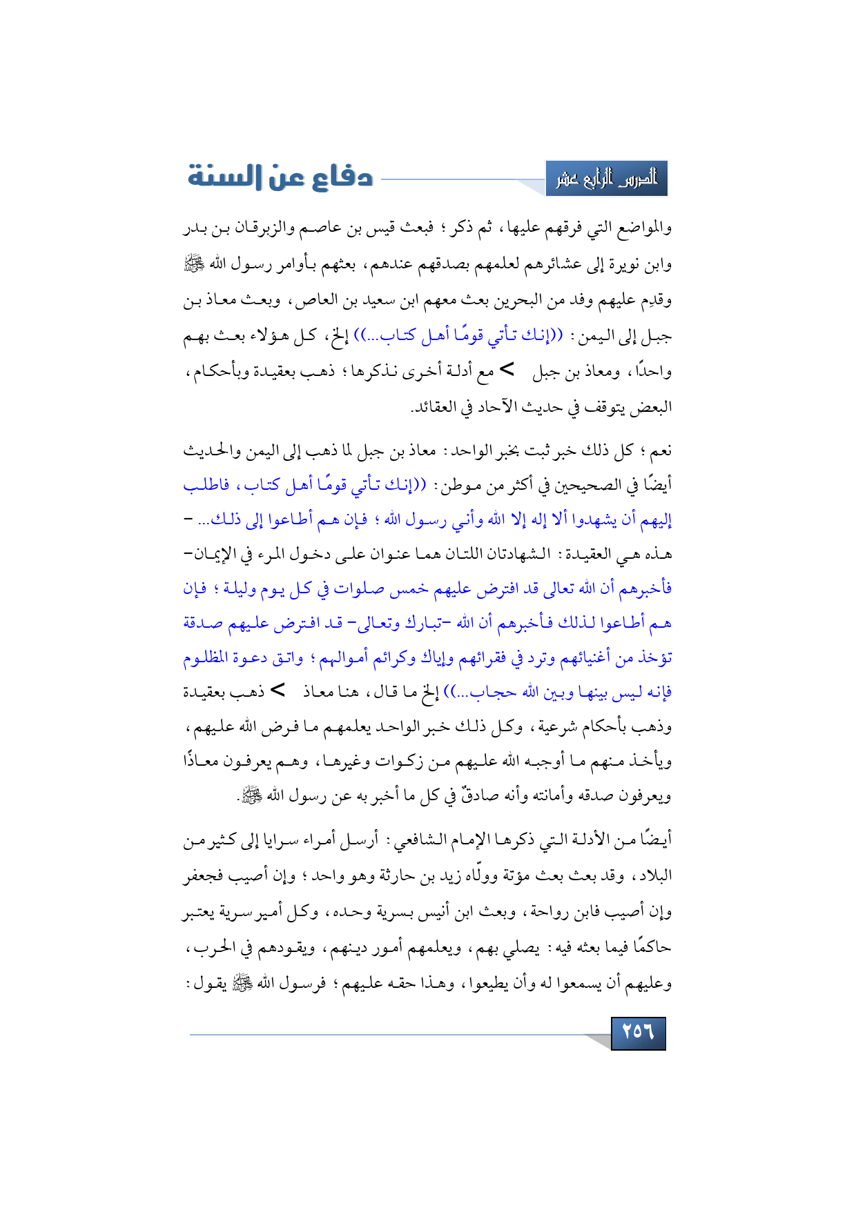 والمواضع التي فرقهم عليها، ثم ذكر؛ فبعث قيس بن عاصم والزبرقان بن بدر وابن نويرة إلى عشائرهم لعلمهم بصدقهم عندهم، بعثهم بأوامر رسول الله -صلى الله عليه وسلم- وقدِم عليهم وفد من البحرين بعث معهم ابن سعيد بن العاص، وبعث معاذ بن جبل إلى اليمن: ((إنك تأتي قومًا أهل كتاب ... )) إلخ، كل هؤلاء بعث بهم واحدًا، ومعاذ بن جبل -رضي الله عنه- مع أدلة أخرى نذكرها؛ ذهب بعقيدة وبأحكام، البعض يتوقف في حديث الآحاد في العقائد.