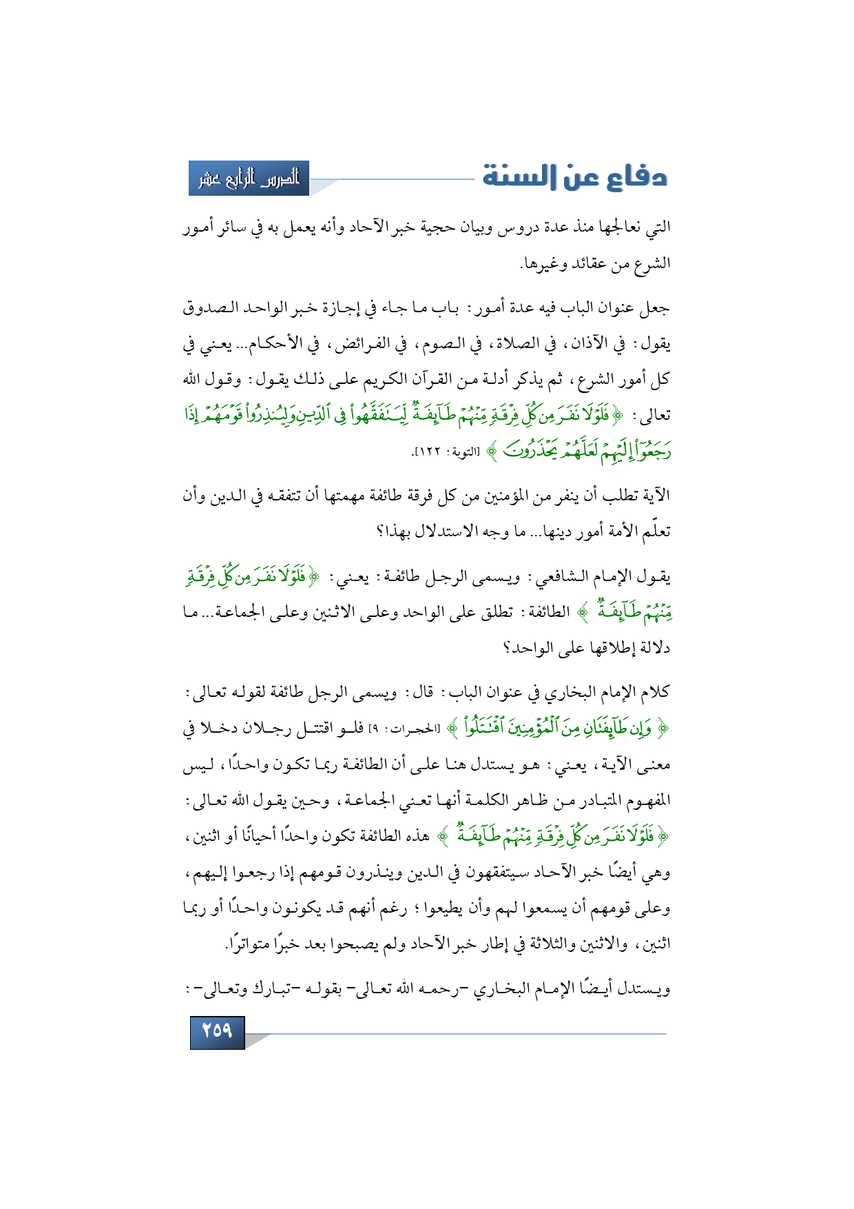 جعل عنوان الباب فيه عدة أمور: باب ما جاء في إجازة خبر الواحد الصدوق يقول: في الآذان، في الصلاة، في الصوم، في الفرائض، في الأحكام ... يعني في كل أمور الشرع، ثم يذكر أدلة من القرآن الكريم على ذلك يقول: وقول الله تعالى: {فَلَوْلَا نَفَرَ مِنْ كُلِّ فِرْقَةٍ مِنْهُمْ طَائِفَةٌ لِيَتَفَقَّهُوا فِي الدِّينِ وَلِيُنْذِرُوا قَوْمَهُمْ إِذَا رَجَعُوا إِلَيْهِمْ لَعَلَّهُمْ يَحْذَرُونَ} (التوبة: 122).