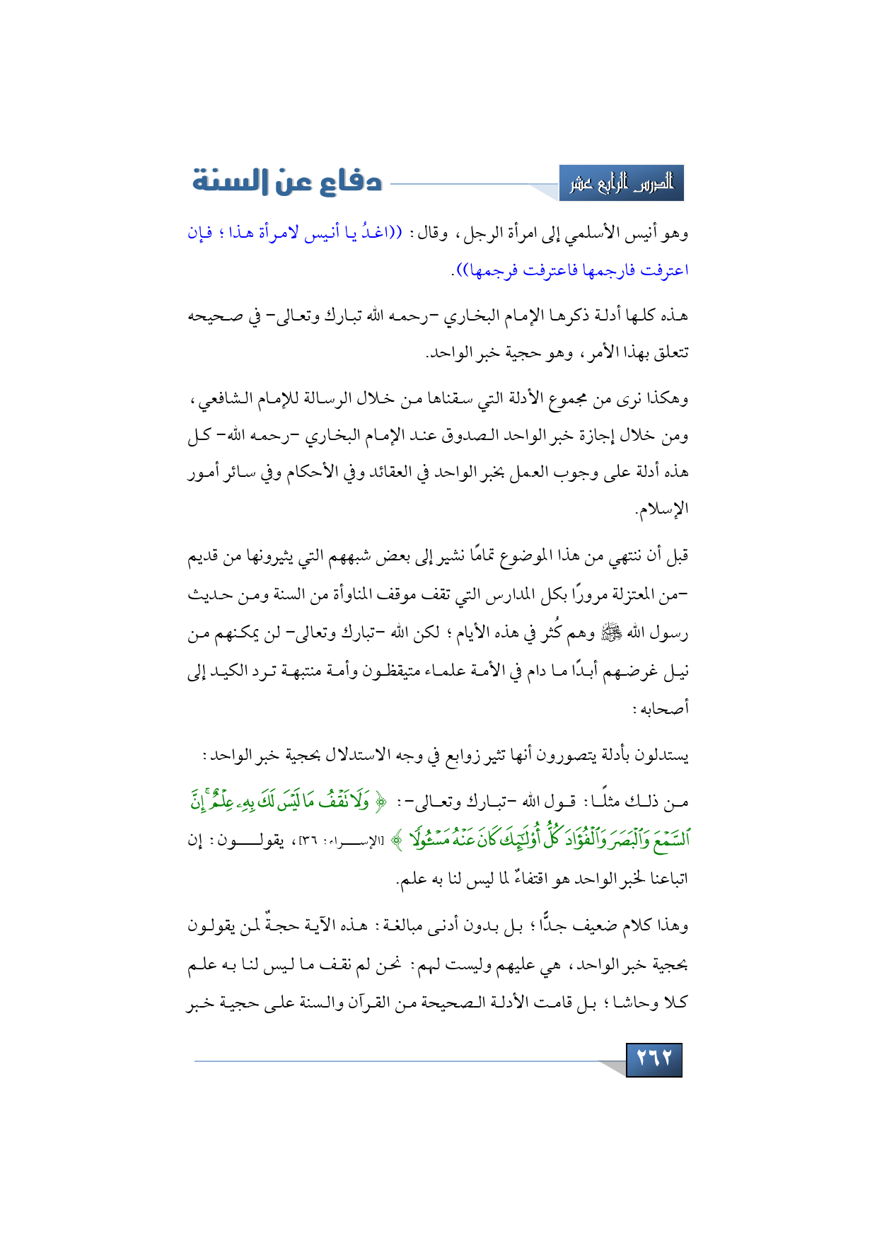من ذلك مثلًا: قول الله -تبارك وتعالى-: {وَلَا تَقْفُ مَا لَيْسَ لَكَ بِهِ عِلْمٌ إِنَّ السَّمْعَ وَالْبَصَرَ وَالْفُؤَادَ كُلُّ أُولَئِكَ كَانَ عَنْهُ مَسْئُولًا} (الإسراء: 36)، يقولون: إن اتباعنا لخبر الواحد هو اقتفاءٌ لما ليس لنا به علم.