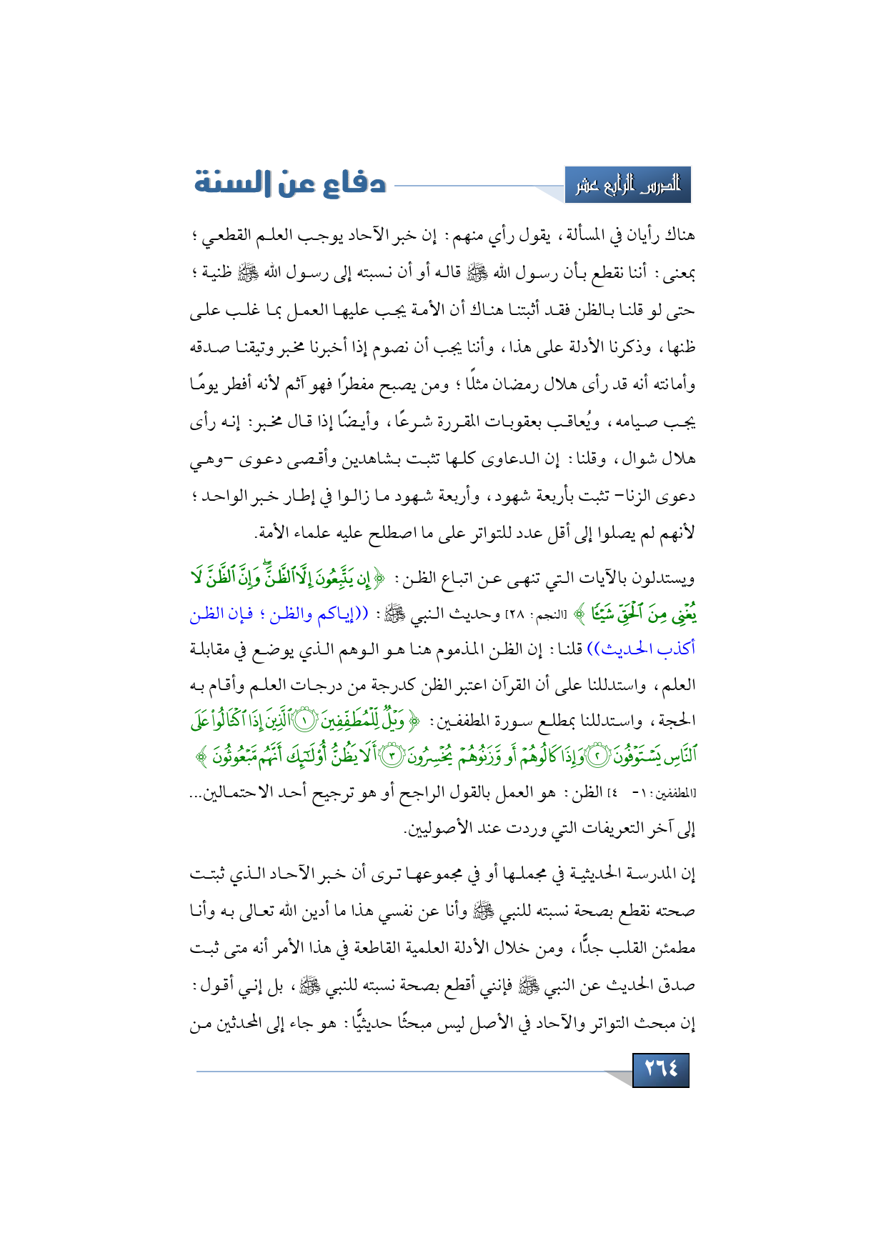 إن المدرسة الحديثية في مجملها أو في مجموعها ترى أن خبر الآحاد الذي ثبتت صحته نقطع بصحة نسبته للنبي -صلى الله عليه وسلم- وأنا عن نفسي هذا ما أدين الله تعالى به وأنا مطمئن القلب جدًّا، ومن خلال الأدلة العلمية القاطعة في هذا الأمر أنه متى ثبت صدق الحديث عن النبي -صلى الله عليه وسلم- فإنني أقطع بصحة نسبته للنبي -صلى الله عليه وسلم-، بل إني أقول: إن مبحث التواتر والآحاد في الأصل ليس مبحثًا حديثيًّا: هو جاء إلى المحدثين من
