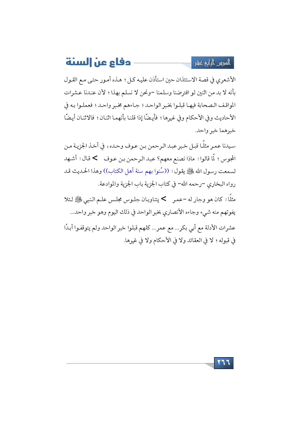 سيدنا عمر مثلًا قبل خبر عبد الرحمن بن عوف وحده، في أخذ الجزية من المجوس؛ لمّا قالوا: ماذا نصنع معهم؟ عبد الرحمن بن عوف -رضي الله عنه- قال: أشهد لسمعت رسول الله -صلى الله عليه وسلم- يقول: ((سُنوا بهم سنة أهل الكتاب)) وهذا الحديث قد رواه البخاري -رحمه الله- في كتاب الجزية باب الجزية والموادعة.