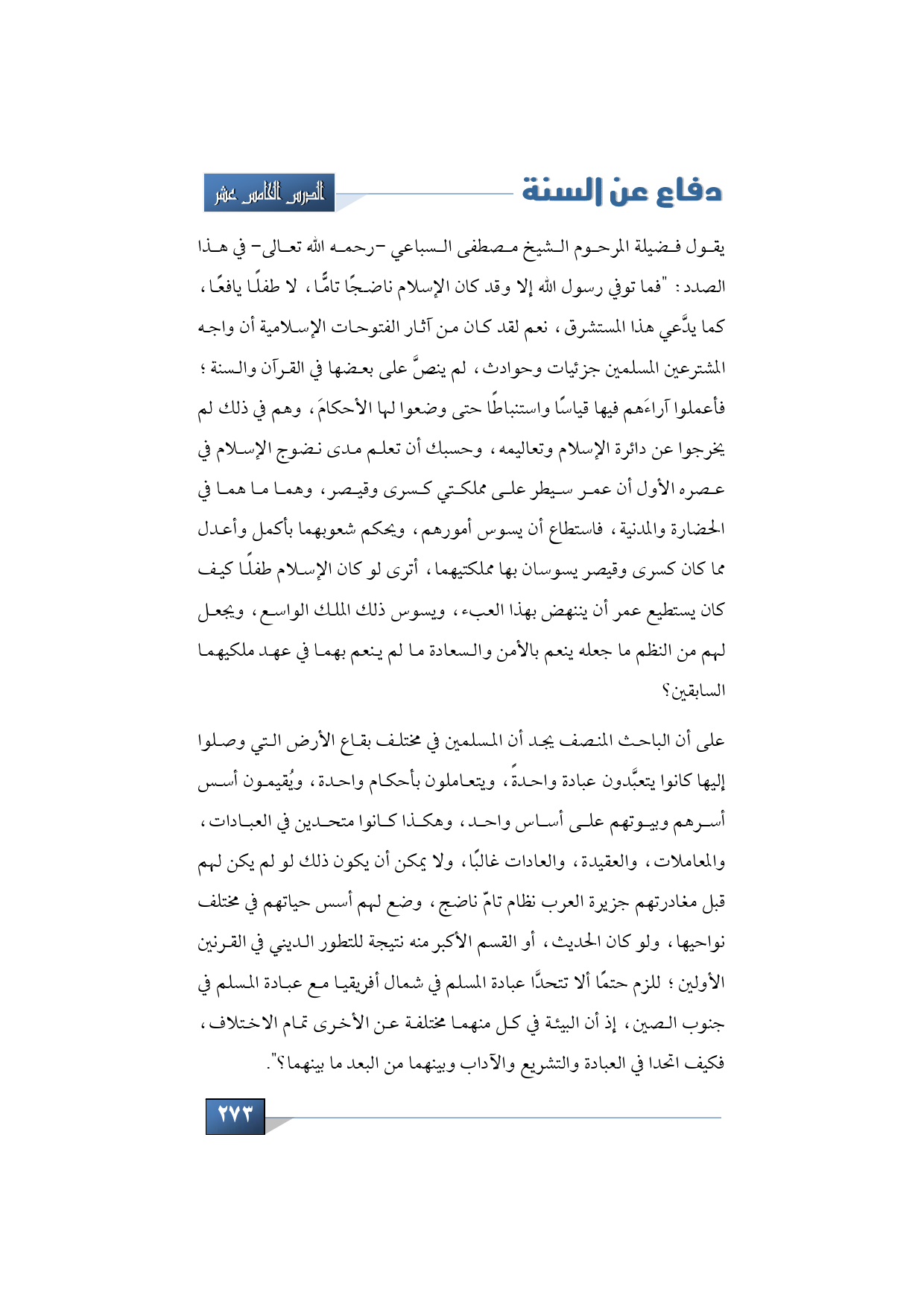 يقول فضيلة المرحوم الشيخ مصطفى السباعي -رحمه الله تعالى- في هذا الصدد: "فما توفي رسول الله إلا وقد كان الإسلام ناضجًا تامًّا، لا طفلًا يافعًا، كما يدَّعي هذا المستشرق، نعم لقد كان من آثار الفتوحات الإسلامية أن واجه المشترعين المسلمين جزئيات وحوادث، لم ينصَّ على بعضها في القرآن والسنة؛ فأعملوا آراءَهم فيها قياسًا واستنباطًا حتى وضعوا لها الأحكامَ، وهم في ذلك لم يخرجوا عن دائرة الإسلام وتعاليمه، وحسبك أن تعلم مدى نضوج الإسلام في عصره الأول أن عمر سيطر على مملكتي كسرى وقيصر، وهما ما هما في الحضارة والمدنية، فاستطاع أن يسوس أمورهم، ويحكم شعوبهما بأكمل وأعدل مما كان كسرى وقيصر يسوسان بها مملكتيهما، أترى لو كان الإسلام طفلًا كيف كان يستطيع عمر أن يننهض بهذا العبء، ويسوس ذلك الملك الواسع، ويجعل لهم من النظم ما جعله ينعم بالأمن والسعادة ما لم ينعم بهما في عهد ملكيهما السابقين؟