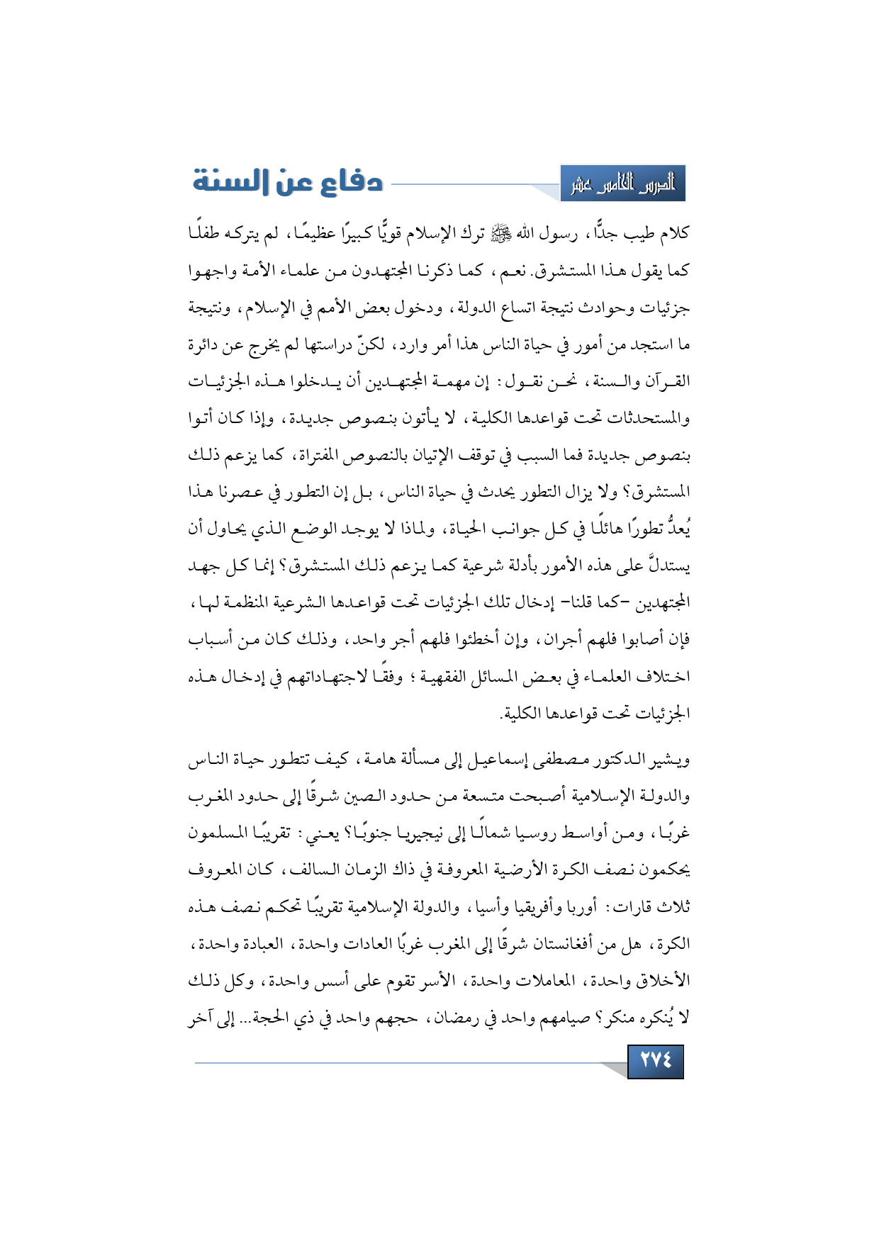 ويشير الدكتور مصطفى إسماعيل إلى مسألة هامة، كيف تتطور حياة الناس والدولة الإسلامة أصبحت متسعة من حدود الصين شرقًا إلى حدود المغرب غربًا، ومن أواسط روسيا شمالًا إلى نيجيريا جنوبًا؟ يعني: تقريبًا المسلمون يحكمون نصف الكرة الأرضية المعروفة في ذاك الزمان السالف، كان المعروف ثلاث قارات: أوربا وأفريقيا وأسيا، والدولة الإسلامية تقريبًا تحكم نصف هذه الكرة، هل من أفغانستان شرقًا إلى المغرب غربًا العادات واحدة، العبادة واحدة، الأخلاق واحدة، المعاملات واحدة، الأسر تقوم على أسس واحدة، وكل ذلك لا يُنكره منكر؟ صيامهم واحد في رمضان، حجهم واحد في ذي الحجة ... إلى آخر