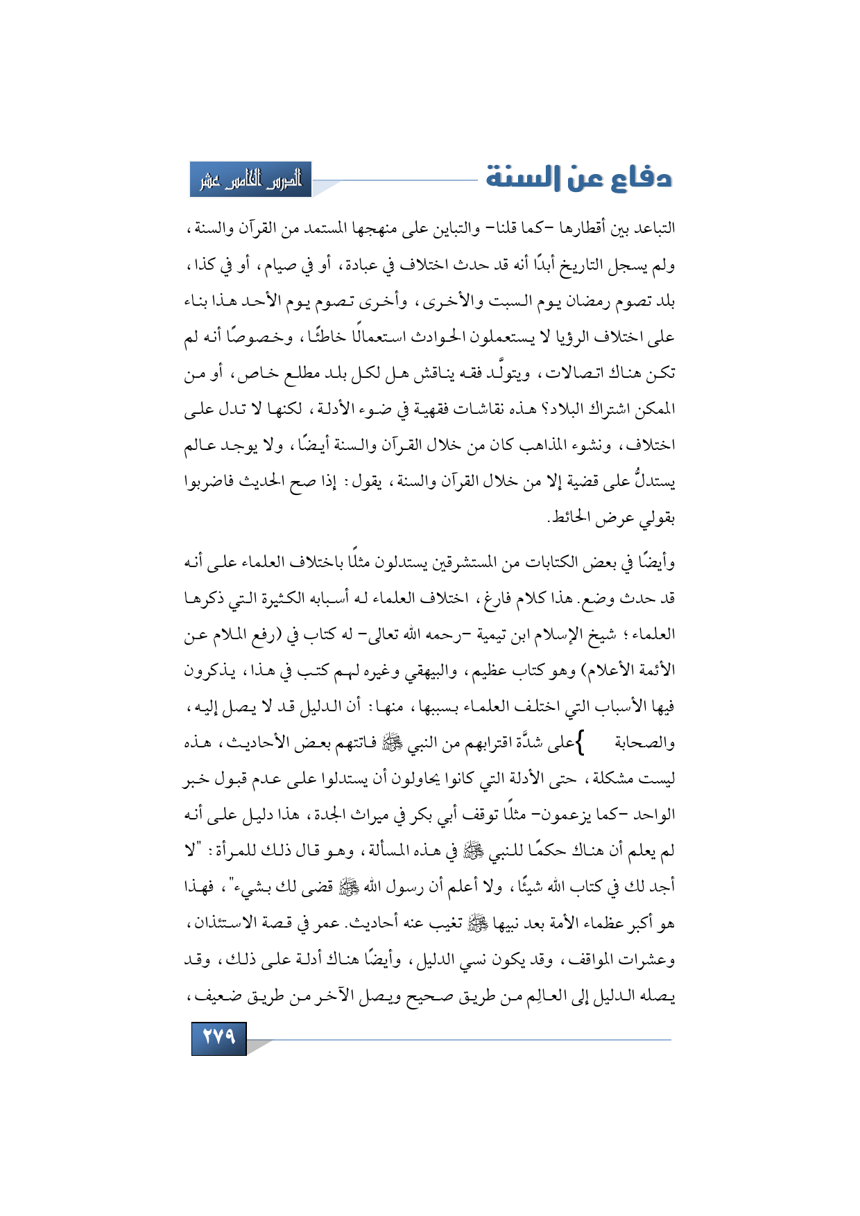 وأيضًا في بعض الكتابات من المستشرقين يستدلون مثلًا باختلاف العلماء على أنه قد حدث وضع. هذا كلام فارغ، اختلاف العلماء له أسبابه الكثيرة التي ذكرها العلماء؛ شيخ الإسلام ابن تيمية -رحمه الله تعالى- له كتاب في (رفع الملام عن الأئمة الأعلام) وهو كتاب عظيم، والبيهقي وغيره لهم كتب في هذا، يذكرون فيها الأسباب التي اختلف العلماء بسببها، منها: أن الدليل قد لا يصل إليه، والصحابة -رضوان الله عليهم- على شدَّة اقترابهم من النبي -صلى الله عليه وسلم- فاتتهم بعض الأحاديث، هذه ليست مشكلة، حتى الأدلة التي كانوا يحاولون أن يستدلوا على عدم قبول خبر الواحد -كما يزعمون- مثلًا توقف أبي بكر في ميراث الجدة، هذا دليل على أنه لم يعلم أن هناك حكمًا للنبي -صلى الله عليه وسلم- في هذه المسألة، وهو قال ذلك للمرأة: "لا أجد لك في كتاب الله شيئًا، ولا أعلم أن رسول الله -صلى الله عليه وسلم- قضى لك بشيء"، فهذا هو أكبر عظماء الأمة بعد نبيها -صلى الله عليه وسلم- تغيب عنه أحاديث. عمر في قصة الاستئذان، وعشرات المواقف، وقد يكون نسي الدليل، وأيضًا هناك أدلة على ذلك، وقد يصله الدليل إلى العالِم من طريق صحيح ويصل الآخر من طريق ضعيف،