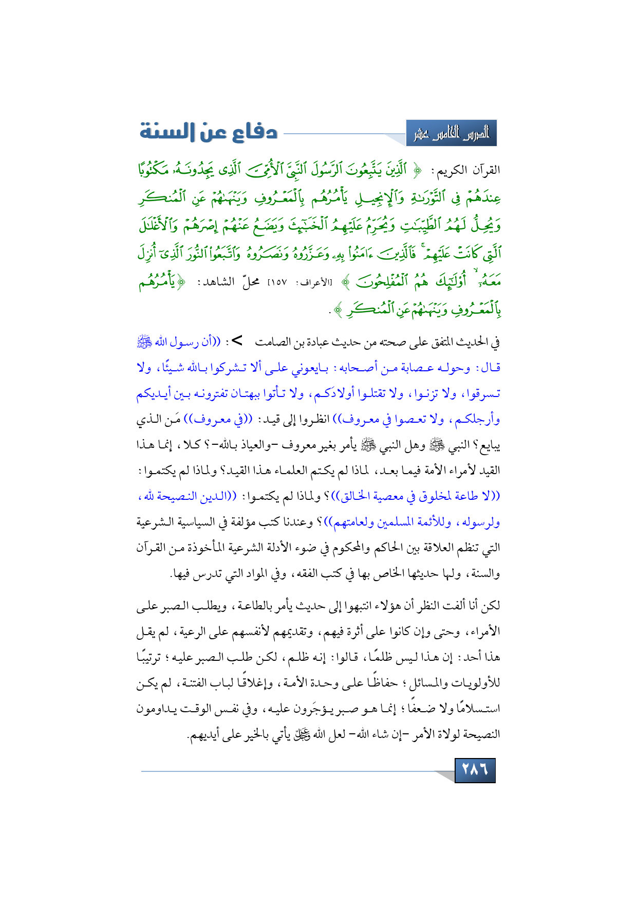 في الحديث المتفق على صحته من حديث عبادة بن الصامت -رضي الله تعالى عنه-: ((أن رسول الله -صلى الله عليه وسلم- قال: وحوله عصابة من أصحابه: بايعوني على ألا تشركوا بالله شيئًا، ولا تسرقوا، ولا تزنوا، ولا تقتلوا أولادَكم، ولا تأتوا ببهتان تفترونه بين أيديكم وأرجلكم، ولا تعصوا في معروف)) انظروا إلى قيد: ((في معروف)) مَن الذي يبايع؟ النبي -صلى الله عليه وسلم- وهل النبي -صلى الله عليه وسلم- يأمر بغير معروف -والعياذ بالله-؟ كلا، إنما هذا القيد لأمراء الأمة فيما بعد، لماذا لم يكتم العلماء هذا القيد؟ ولماذا لم يكتموا: ((لا طاعة لمخلوق في معصية الخالق))؟ ولماذا لم يكتموا: ((الدين النصيحة لله، ولرسوله، وللأئمة المسلمين ولعامتهم))؟ وعندنا كتب مؤلفة في السياسية الشرعية التي تنظم العلاقة بين الحاكم والمحكوم في ضوء الأدلة الشرعية المأخوذة من القرآن والسنة، ولها حديثها الخاص بها في كتب الفقه، وفي المواد التي تدرس فيها.