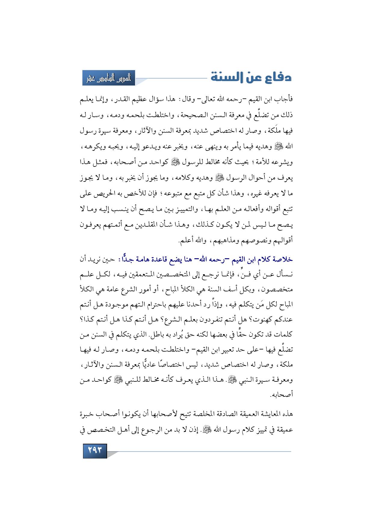 خلاصة كلام ابن القيم -رحمه الله- هنا يضع قاعدة هامة جدًّا: حين نريد أن نسأل عن أي فنٍّ، فإنما نرجع إلى المتخصصين المتعمقين فيه، لكل علم متخصصون، وبكل أسف السنة هي الكلأ المباح، أو أمور الشرع عامة هي الكلأ المباح لكل مَن يتكلم فيه، وإذاَّ رد أحدنا عليهم باحترام التهم موجودة هل أنتم عندكم كهنوت؟ هل أنتم تنفردون بعلم الشرع؟ هل أنتم كذا هل أنتم كذا؟ كلمات قد تكون حقًّا في بعضها لكنه حق يُراد به باطل. الذي يتكلم في السنن من تضلَّع فيها -على حد تعبير ابن القيم- واختلطت بلحمه ودمه، وصار له فيها ملكة، وصار له اختصاص شديد، ليس اختصاصًا عاديًّا بمعرفة السنن والآثار، ومعرفة سيرة النبي -صلى الله عليه وسلم-. هذا الذي يعرف كأنه مخالط للنبي -صلى الله عليه وسلم- كواحد من أصحابه.