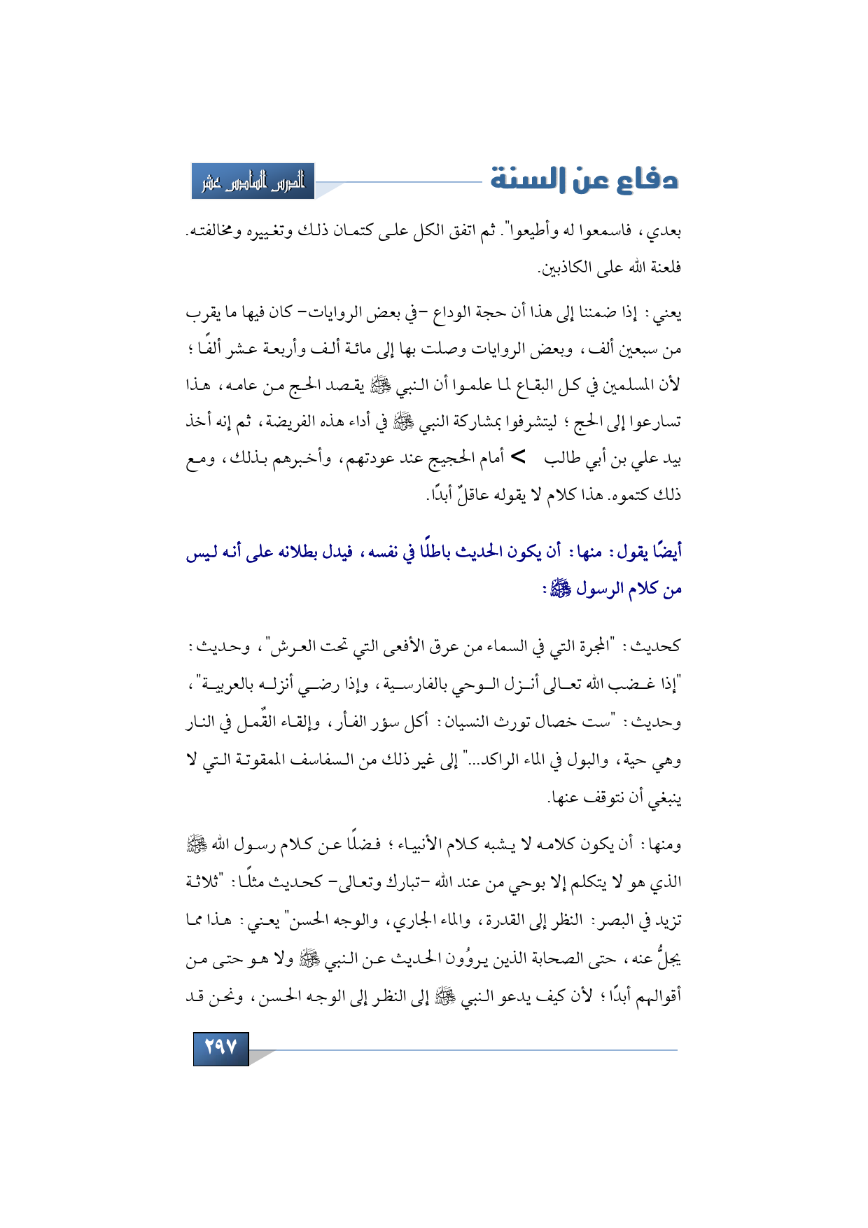 ومنها: أن يكون كلامه لا يشبه كلام الأنبياء؛ فضلًا عن كلام رسول الله -صلى الله عليه وسلم- الذي هو لا يتكلم إلا بوحي من عند الله -تبارك وتعالى- كحديث مثلًا: "ثلاثة تزيد في البصر: النظر إلى القدرة، والماء الجاري، والوجه الحسن" يعني: هذا مما يجلُّ عنه، حتى الصحابة الذين يروُون الحديث عن النبي -صلى الله عليه وسلم- ولا هو حتى من أقوالهم أبدًا؛ لأن كيف يدعو النبي -صلى الله عليه وسلم- إلى النظر إلى الوجه الحسن، ونحن قد
