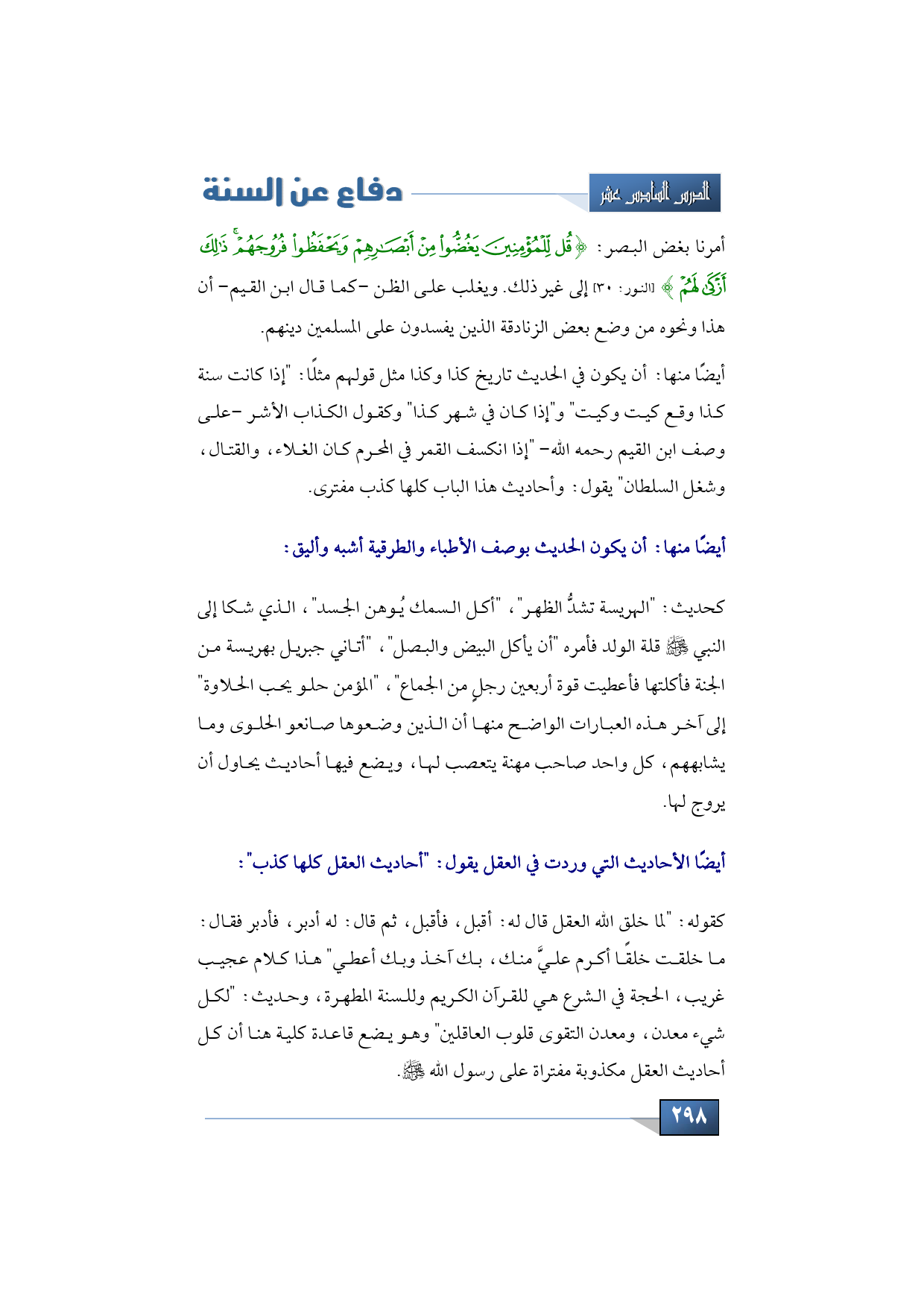 أيضًا الأحاديث التي وردت في العقل يقول: "أحاديث العقل كله اكذب" كقوله: "لما خلق الله العقل قال له: أقبل، فأقبل، ثم قال: له أدبر، فأدبر فقال: ما خلقت خلقًا أكرم عليَّ منك، بك آخذ وبك أعطي " هذا كلام عجيب غريب، الحجة في الشرع هي للقرآن الكريم وللسنة المطهرة، وحديث: "لكل شيء معدن، ومعدن التقوى قلوب العاقلين" وهو يضع قاعدة كلية هنا أن كل أحاديث العقل مكذوبة مفتراة على رسول الله -صلى الله عليه وسلم-.