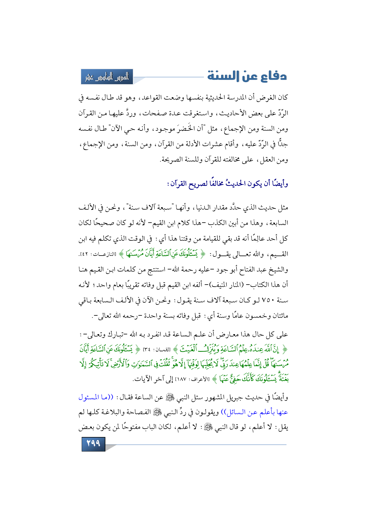 وأيضًا أن يكون الحديثُ مخالفًا لصريح القرآن مثل حديث الذي حدَّد مقدار الدنيا، وأنها "سبعة آلاف سنة "، ونحن في الألف السابعة، وهذا من أبين الكذب -هذا كلام ابن القيم- لأنه لو كان صحيحًا لكان كل أحد عالِمًا أنه قد بقي للقيامة من وقتنا هذا أي: في الوقت الذي تكلم فيه ابن القيم، والله تعالى يقول: {يَسْأَلُونَكَ عَنِ السَّاعَةِ أَيَّانَ مُرْسَاهَا} (النازعات: 42). والشيخ عبد الفتاح أبو جود -عليه رحمة الله- استنتج من كلمات ابن القيم هنا أن هذا الكتاب- (المنار المنيف) - ألفه ابن القيم قبل وفاته تقريبًا بعام واحد؛ لأنه سنة 750 لو كان سبعة آلاف سنة يقول: ونحن الآن في الألف السابعة باقي مائتان وخمسون عامًا وسنة أي: قبل وفاته بسنة واحدة -رحمه الله تعالى-.