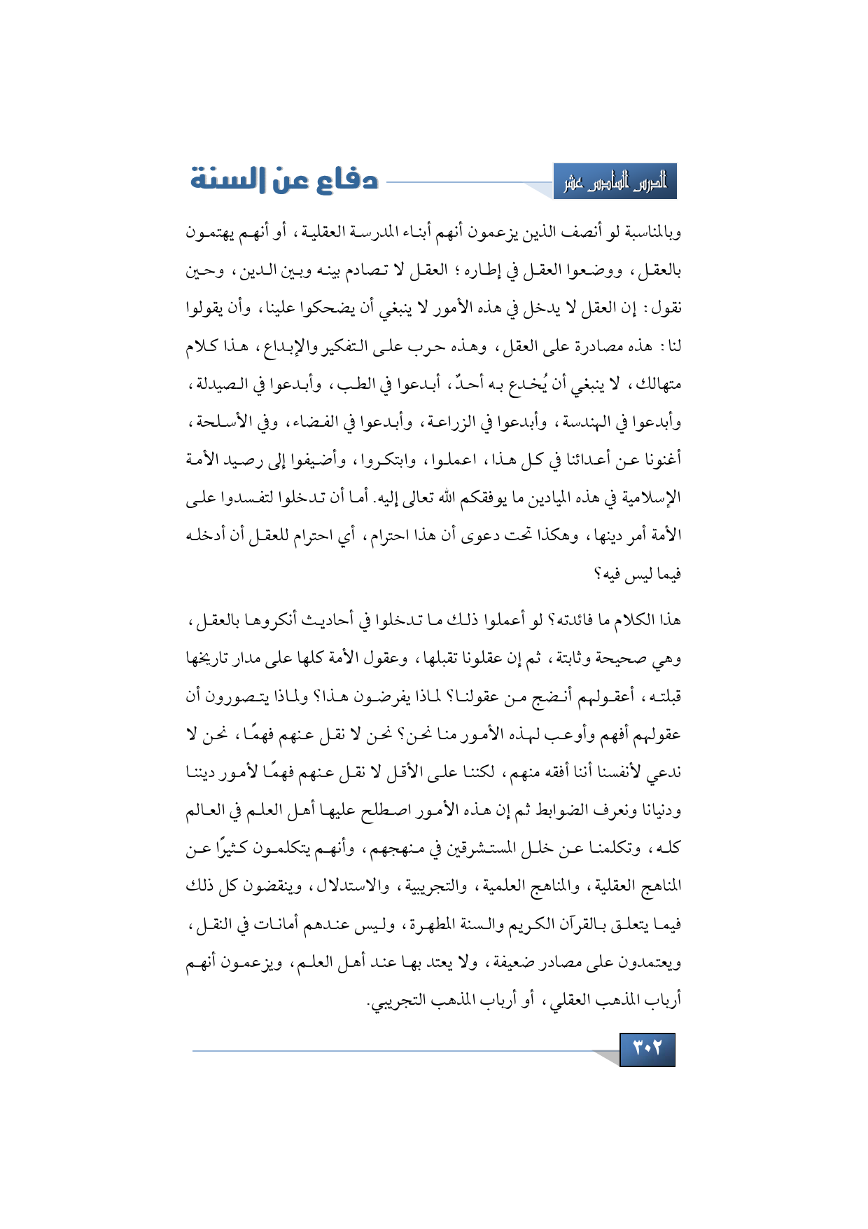 هذا الكلام ما فائدته؟ لو أعملوا ذلك ما تدخلوا في أحاديث أنكروها بالعقل، وهي صحيحة وثابتة، ثم إن عقلونا تقبلها، وعقول الأمة كلها على مدار ال ال تاريخها قبلته، أعقولهم أنضج من عقولنا؟ لماذا يفرضون هذا؟ ولماذا يتصورون أن عقولهم أفهم وأوعب لهذه الأمور منا نحن؟ نحن لا نقل عنهم فهمًا، نحن لا ندعي لأنفسنا أننا أفقه منهم، لكننا على الأقل لا نقل عنهم فهمًا لأمور ديننا ودنيانا ونعرف الضوابط ثم إن هذه الأمور اصطلح عليها أهل العلم في العالم كله، وتكلمنا عن خلل المستشرقين في منهجهم، وأنهم يتكلمون كثيرًا عن المناهج العقلية، والمناهج العلمية، والتجريبية، والاستدلال، وينقضون كل ذلك فيما يتعلق بالقرآن الكريم والسنة المطهرة، وليس عندهم أمانات في النقل، ويعتمدون على مصادر ضعيفة، ولا يعتد بها عند أهل العلم، ويزعمون أنهم أرباب المذهب العقلي، أو أرباب المذهب التجريبي.