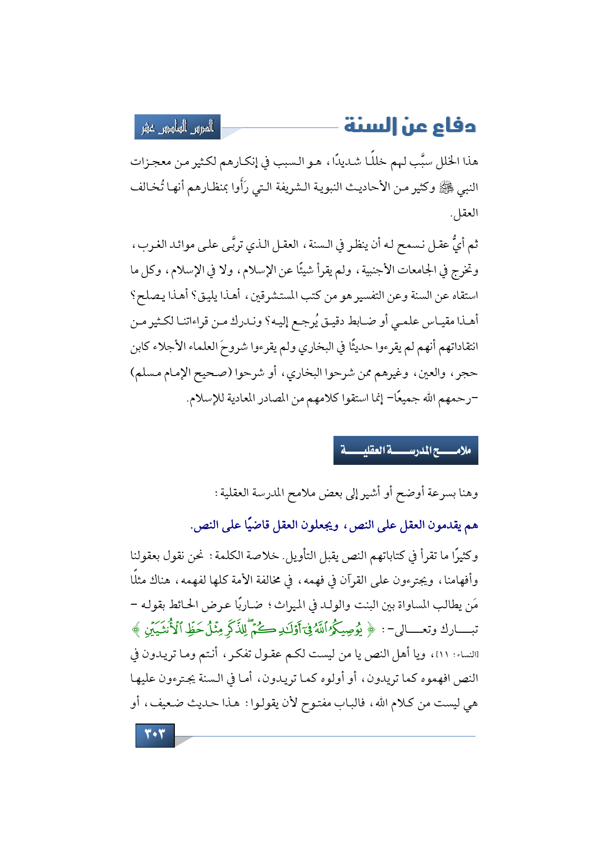 أولًا: هم يقدمون العقل على النص، ويجعلون العقل قاضيًا على النص، وكثيرًا ما تقرأ في كتاباتهم النص يقبل التأويل. خلاصة الكلمة: نحن نقول بعقولنا وأفهامنا، ويجترءون على القرآن في فهمه، في مخالفة الأمة كلها لفهمه، هناك مثلًا مَن يطالب المساواة بين البنت والولد في الميراث؛ ضاربًا عرض الحائط بقوله -تبارك وتعالى-: {يُوصِيكُمُ اللَّهُ فِي أَوْلَادِكُمْ لِلذَّكَرِ مِثْلُ حَظِّ الْأُنْثَيَيْنِ} (النساء: 11)، ويا أهل النص يا من ليست لكم عقول تفكر، أنتم وما تريدون في النص افهموه كما تريدون، أو أولوه كما تريدون، أما في السنة يجترءون عليها هي ليست من كلام الله، فالباب مفتوح لأن يقولوا: هذا حديث ضعيف، أو