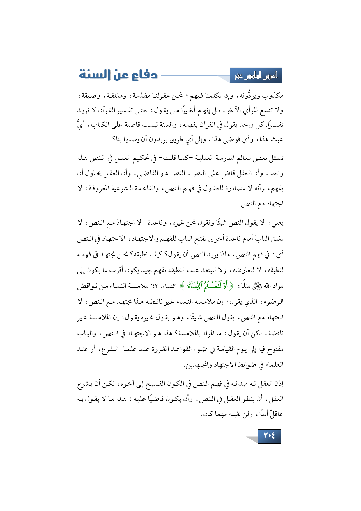 ملامح أو بعض معالم المدرسة العقلية، تتمثل -كما قلت- في تحكيم العقل في النص هذا واحد، وأن العقل قاضٍ على النص، النص هو القاضي، وأن العقل يحاول أن يفهم، وأنه لا مصادرة للعقول في فهم النص، والقاعدة الشرعية المعروفة: لا اجتهادَ مع النص. يعني: لا يقول النص شيئًا ونقول نحن غيره، وقاعدة: لا اجتهادَ مع النص، لا تغلق البابَ أمام قاعدة أخرى تفتح الباب للفهم والاجتهاد، الاجتهاد في النص أي: في فهم النص، ماذا يريد النص أن يقول؟ كيف نطبقه؟ نحن نجتهد في فهمه لنطبقه، لا لنعارضه، ولا لنبعتد عنه، لنطبقه بفهم جيد يكون أقرب ما يكون إلى مراد الله -عز وجل- مثلًا: {أَوْ لَامَسْتُمُ النِّسَاءَ} (النساء: 43) ملامسة النساء من نواقض الوضوء، الذي يقول: إن ملامسة النساء غير ناقضة هذا يجتهد مع النص، لا اجتهادَ مع النص، يقول النص شيئًا، وهو يقول غيره يقول: إن الملامسة غير ناقضة، لكن أن يقول: ما المراد بالملامسة؟ هذا هو الاجتهاد في النص، والباب مفتوح فيه إلى يوم القيامة في ضوء القواعد المقررة عند علماء الشرع، أو عند العلماء في ضوابط الاجتهاد والمجتهدين.