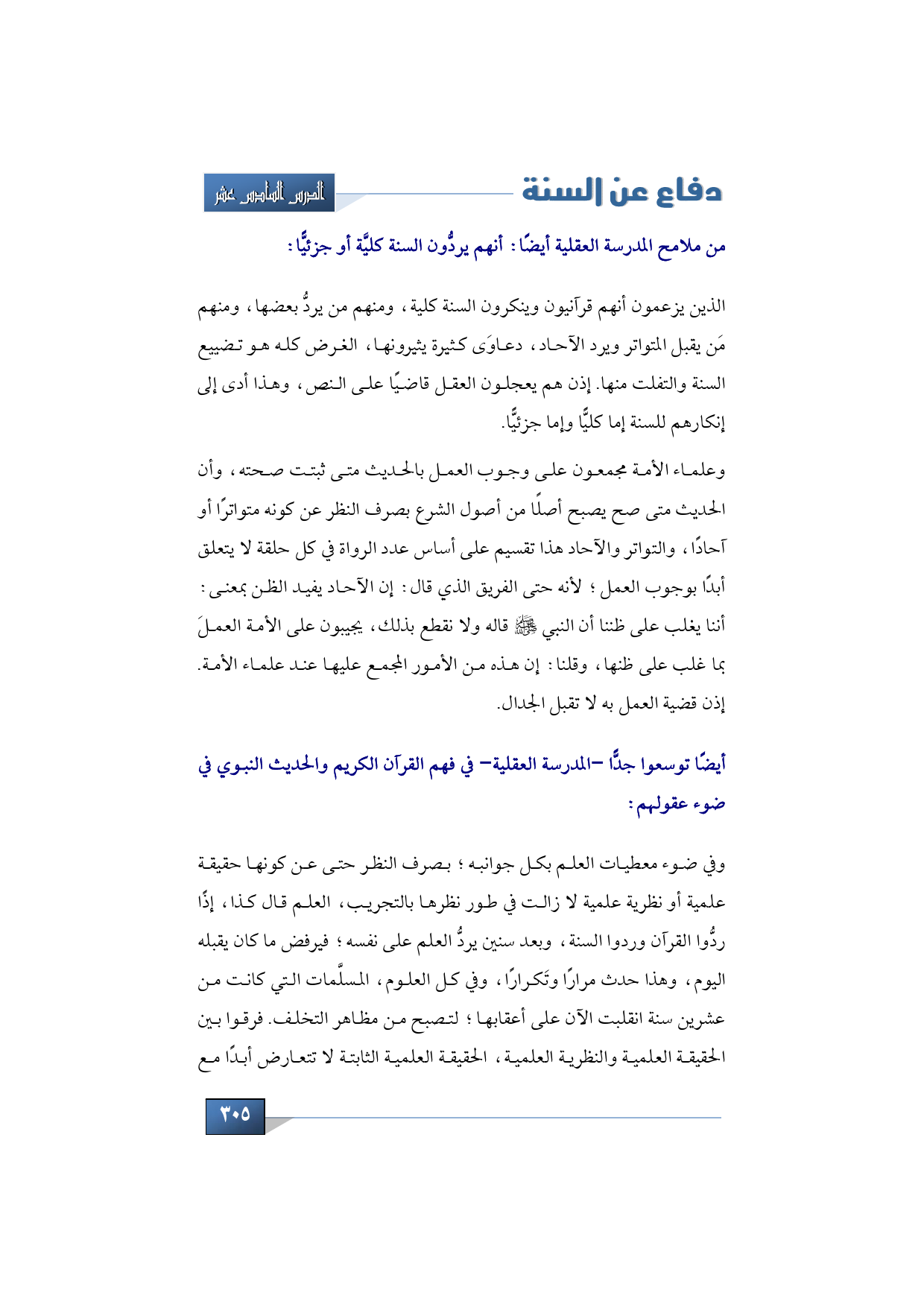 من ملامح المدرسة العقلية أيضًا: أنهم يردُّون السنة كليَّة أو جزئيًّا. الذين يزعمون أنهم قرآءنيون وينكرون السنة كلية، ومنهم من يردُّ بعضها، ومنهم مَن يقبل المتواتر ويرد الآحاد، دعاوَى كثيرة يثيرونها، الغرض كله هو تضييع السنة والتفلت منها. إذن هم يعجلون العقل قاضيًا على النص، وهذا أدى إلى إنكارهم للسنة إما كليًّا وإما جزئيًّا.
