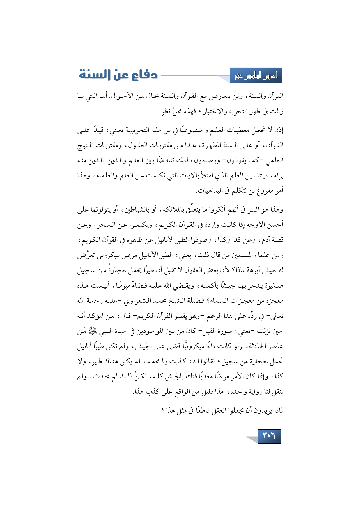وهذا هو السر في أنهم أنكروا ما يتعلَّق بالملائكة، أو بالشياطين، أو يئولونها على أحسن الأوجه إذا كانت واردة في القرآن الكريم، وتكلموا عن السحر، وعن قصة آدم، وعن كذا وكذا، وصرفوا الطير الأبابيل عن ظاهره في القرآن الكريم، ومن علماء المسلمين من قال ذلك، يعني: الطير الأبابيل مرض ميكروبي تعرَّض له جيش أبرهه لماذا؟ لأن بعض العقول لا تقبل أن طيرًا يحمل حجارةً من سجيل صغيرة يدحر بها جيشًا بأكمله، ويقضي الله عليه قضاءً مبرمًا، أليست هذه معجزة من معجزات السماء؟ فضيلة الشيخ محمد الشعراوي -عليه رحمة الله تعالى- في ردِّه على هذا الزعم -وهو يفسر القرآن الكريم- قال: من المؤكد أنه حين نزلت -يعني: سورة الفيل- كان من بين الموجودين في حياة النبي -صلى الله عليه وسلم- مَن عاصر الحادثة، ولو كانت داءًا ميكروبيًّا قضى على الجيش، ولم تكن طيرًا أبابيبلَ تحمل حجارة من سجيل؛ لقالوا له: كذبت يا محمد، لم يكن هناك طير، ولا كذا، وإنما كان الأمر مرضًا معديًا فتك بالجيش كله، لكنَّ ذلك لم يحدث، ولم تنقل لنا رواية واحدة، هذا دليل من الواقع على كذب هذا.