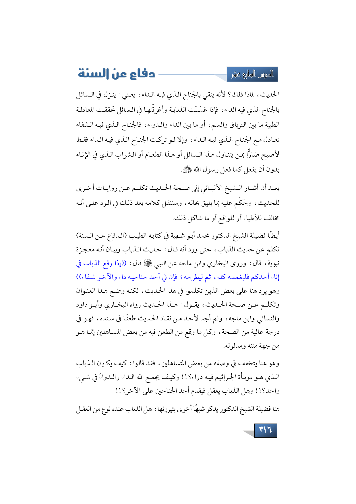 أيضًا فضيلة الشيخ الدكتور محمد أبو شهبة في كتابه الطيب (الدفاع عن السنة) تكلم عن حديث الذباب، حتى ورد أنه قال: حديث الذباب وبيان أنه معجزة نبوية، قال: وروى البخاري وابن ماجه عن النبي -صلى الله عليه وسلم- قال: ((إذا وقع الذباب في إناء أحدكم فليغمسه كله، ثم ليطرحه؛ فإن في أحد جناحيه داء والآخر شفاء)) وهو يرد هنا على بعض الذين تكلموا في هذا الحديث، لكنه وضع هذا العنوان وتكلم عن صحة الحديث، يقول: هذا الحديث رواه البخاري وأبو داود والنسائي وابن ماجه، ولم أجد لأحد من نقاد الحديث طعنًا في سنده، فهو في درجة عالية من الصحة، وكل ما وقع من الطعن فيه من بعض المتساهلين إنما هو من جهة متنه ومدلوله.