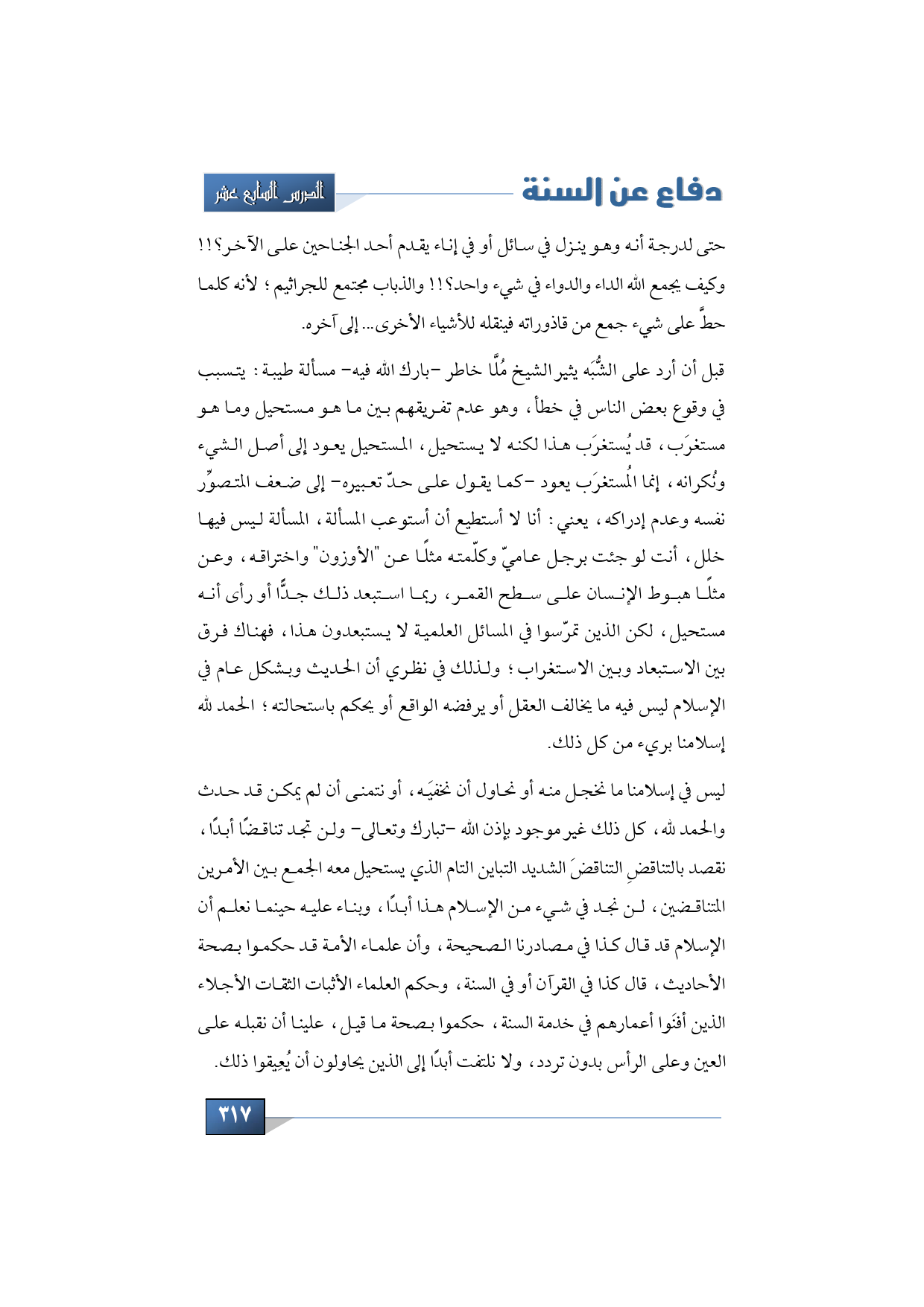 قبل أن أرد على الشُّبَه يثير الشيخ مُلَّا خاطر -بارك الله فيه- مسألة طيبة: يتسبب في وقوع بعض الناس في خطأ، وهو عدم تفريقهم بين ما هو مستحيل وما هو مستغرَب، قد يُستغرَب هذا لكنه لا يستحيل، المستحيل يعود إلى أصل الشيء ونُكرانه، إنما المُستغرَب يعود -كما يقول على حدّ تعبيره- إلى ضعف المتصوِّر نفسه وعدم إدراكه، يعني: أنا لا أستطيع أن أستوعب المسألة، المسألة ليس فيها خلل، أنت لو جئت برجل عاميّ وكلّمته مثلًا عن "الأوزون" واختراقه، وعن مثلًا هبوط الإنسان على سطح القمر، ربما استبعد ذلك جدًّا أو رأى أنه مستحيل، لكن الذين تمرّسوا في المسائل العلمية لا يستبعدون هذا، فهناك فرق بين الاستبعاد وبين الاستغراب؛ ولذلك في نظري أن الحديث وبشكل عام في الإسلام ليس فيه ما يخالف العقل أو يرفضه الواقع أو يحكم باستحالته؛ الحمد لله إسلامنا بريء من كل ذلك.