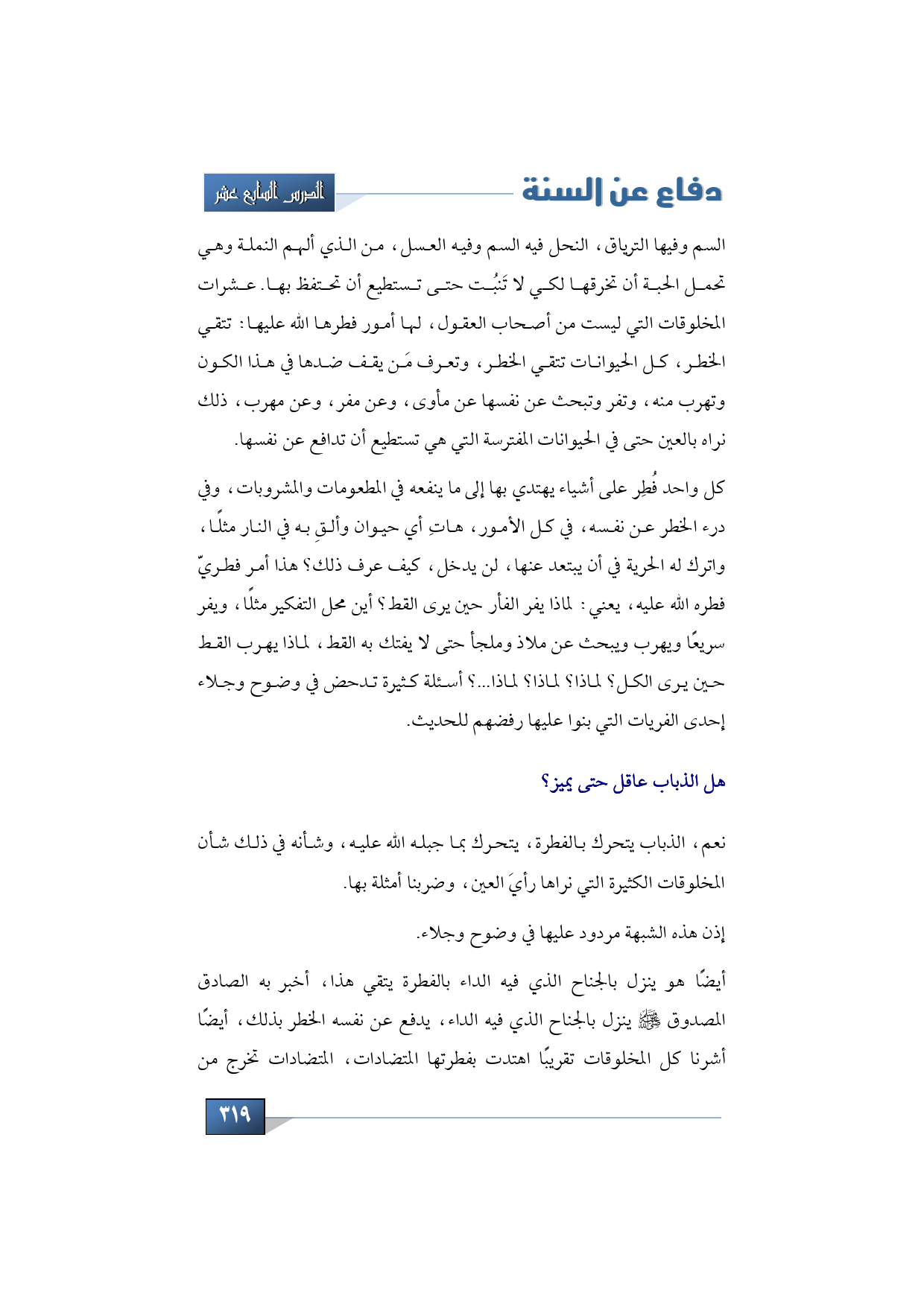 السم وفيها الترياق، النحل فيه السم وفيه العسل، من الذي ألهم النملة وهي تحمل الحبة أن تخرقها لكي لا تَنبُت حتى تستطيع أن تحتفظ بها. عشرات المخلوقات التي ليست من أصحاب العقول، لها أمور فطرها الله عليها: تتقي الخطر، كل الحيوانات تتقي الخطر، وتعرف مَن يقف ضدها في هذا الكون وتهرب منه، وتفر وتبحث عن نفسها عن مأوى، وعن مفر، وعن مهرب، ذلك نراه بالعين حتى في الحيوانات المفترسة التي هي تستطيع أن تدافع عن نفسها.